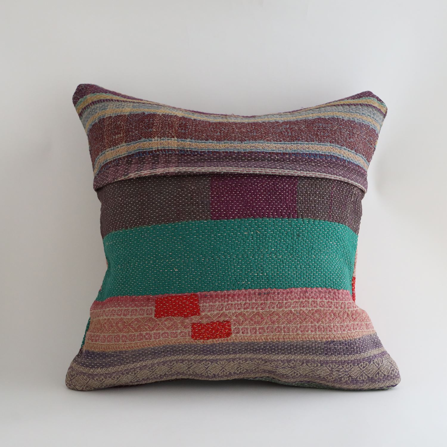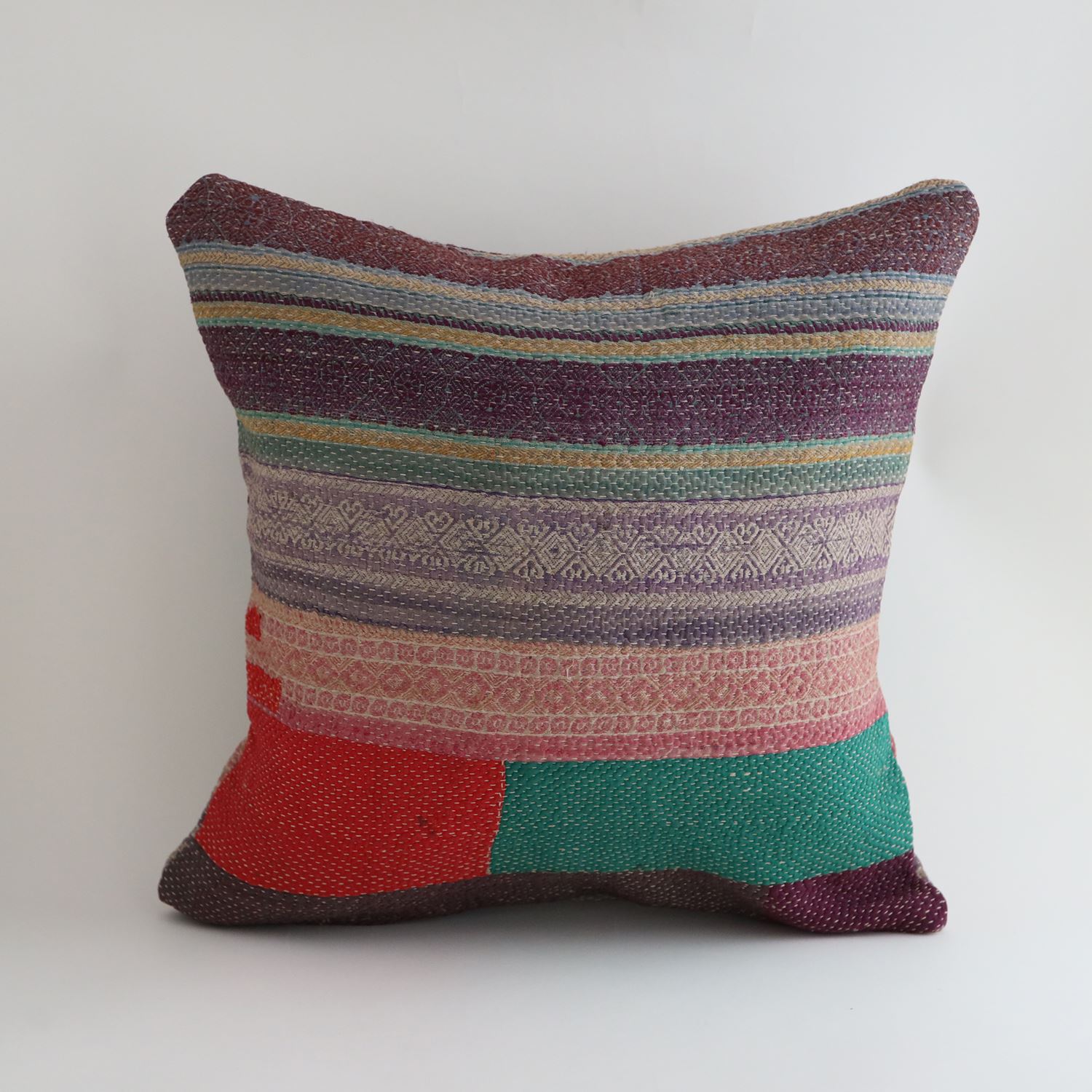 ラリーキルトを使ったクッションカバーです。ラリーキルトは、インド・パキスタンなどの中東アジアで、永い間受け継がれてきた伝統的な布です。古くなったサリーやデュパタ、腰布・古いハギレ等を貼り合わせてパッチワークし、丁寧に刺し子で合わせたもの。インダス河流域の遊牧民の家々では、嫁入り道具として母親から娘へ受け継がれています。気の遠くなるような作業を経て、わが子へ想いをこめて手渡します。一枚一枚に物語があって、何千年にも渡り母から娘へと伝えられる品。布の貼り合わせ方、刺し子の細やかさ、生地の厚みや柄など1つとして同じものはありません。丁寧にハンドメイドで作られているからこその味わいと魅力があります。