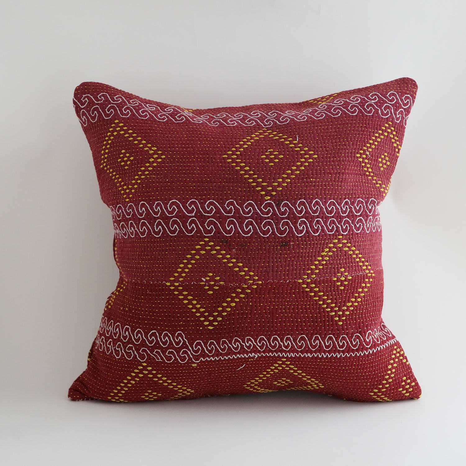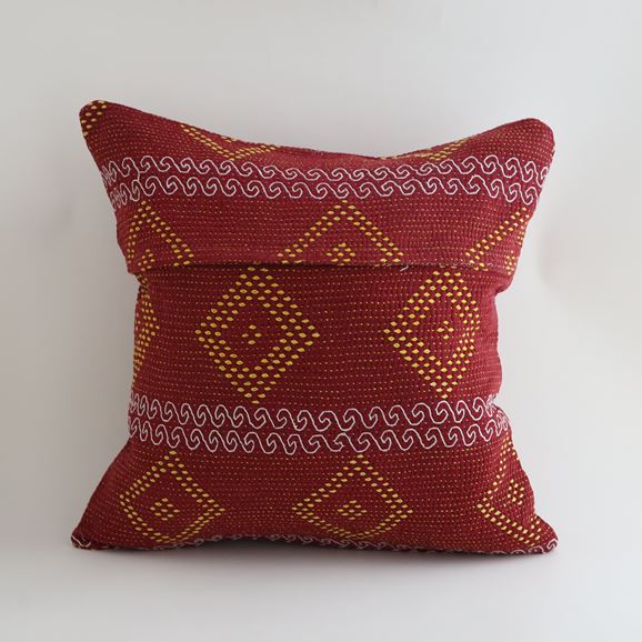 ラリーキルトを使ったクッションカバーです。ラリーキルトは、インド・パキスタンなどの中東アジアで、永い間受け継がれてきた伝統的な布です。古くなったサリーやデュパタ、腰布・古いハギレ等を貼り合わせてパッチワークし、丁寧に刺し子で合わせたもの。インダス河流域の遊牧民の家々では、嫁入り道具として母親から娘へ受け継がれています。気の遠くなるような作業を経て、わが子へ想いをこめて手渡します。一枚一枚に物語があって、何千年にも渡り母から娘へと伝えられる品。布の貼り合わせ方、刺し子の細やかさ、生地の厚みや柄など1つとして同じものはありません。丁寧にハンドメイドで作られているからこその味わいと魅力があります。