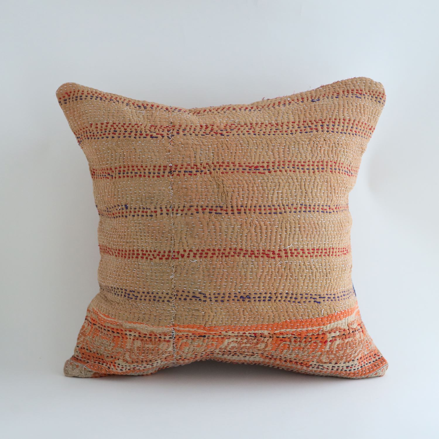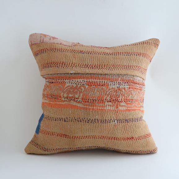 ラリーキルトを使ったクッションカバーです。ラリーキルトは、インド・パキスタンなどの中東アジアで、永い間受け継がれてきた伝統的な布です。古くなったサリーやデュパタ、腰布・古いハギレ等を貼り合わせてパッチワークし、丁寧に刺し子で合わせたもの。インダス河流域の遊牧民の家々では、嫁入り道具として母親から娘へ受け継がれています。気の遠くなるような作業を経て、わが子へ想いをこめて手渡します。一枚一枚に物語があって、何千年にも渡り母から娘へと伝えられる品。布の貼り合わせ方、刺し子の細やかさ、生地の厚みや柄など1つとして同じものはありません。丁寧にハンドメイドで作られているからこその味わいと魅力があります。
