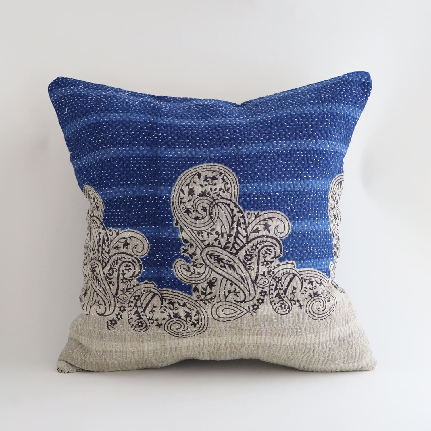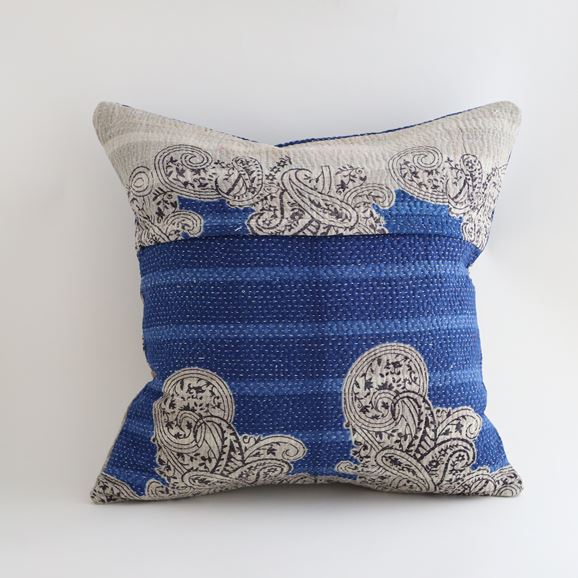 ラリーキルトを使ったクッションカバーです。ラリーキルトは、インド・パキスタンなどの中東アジアで、永い間受け継がれてきた伝統的な布です。古くなったサリーやデュパタ、腰布・古いハギレ等を貼り合わせてパッチワークし、丁寧に刺し子で合わせたもの。インダス河流域の遊牧民の家々では、嫁入り道具として母親から娘へ受け継がれています。気の遠くなるような作業を経て、わが子へ想いをこめて手渡します。一枚一枚に物語があって、何千年にも渡り母から娘へと伝えられる品。布の貼り合わせ方、刺し子の細やかさ、生地の厚みや柄など1つとして同じものはありません。丁寧にハンドメイドで作られているからこその味わいと魅力があります。