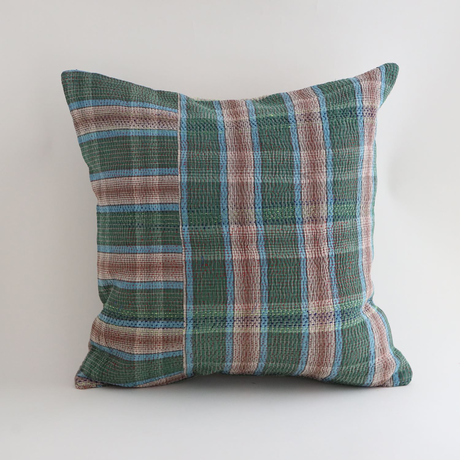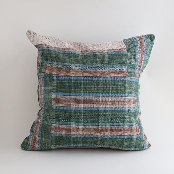 ラリーキルトを使ったクッションカバーです。ラリーキルトは、インド・パキスタンなどの中東アジアで、永い間受け継がれてきた伝統的な布です。古くなったサリーやデュパタ、腰布・古いハギレ等を貼り合わせてパッチワークし、丁寧に刺し子で合わせたもの。インダス河流域の遊牧民の家々では、嫁入り道具として母親から娘へ受け継がれています。気の遠くなるような作業を経て、わが子へ想いをこめて手渡します。一枚一枚に物語があって、何千年にも渡り母から娘へと伝えられる品。布の貼り合わせ方、刺し子の細やかさ、生地の厚みや柄など1つとして同じものはありません。丁寧にハンドメイドで作られているからこその味わいと魅力があります。