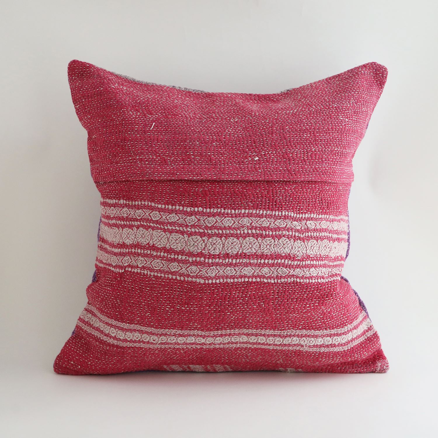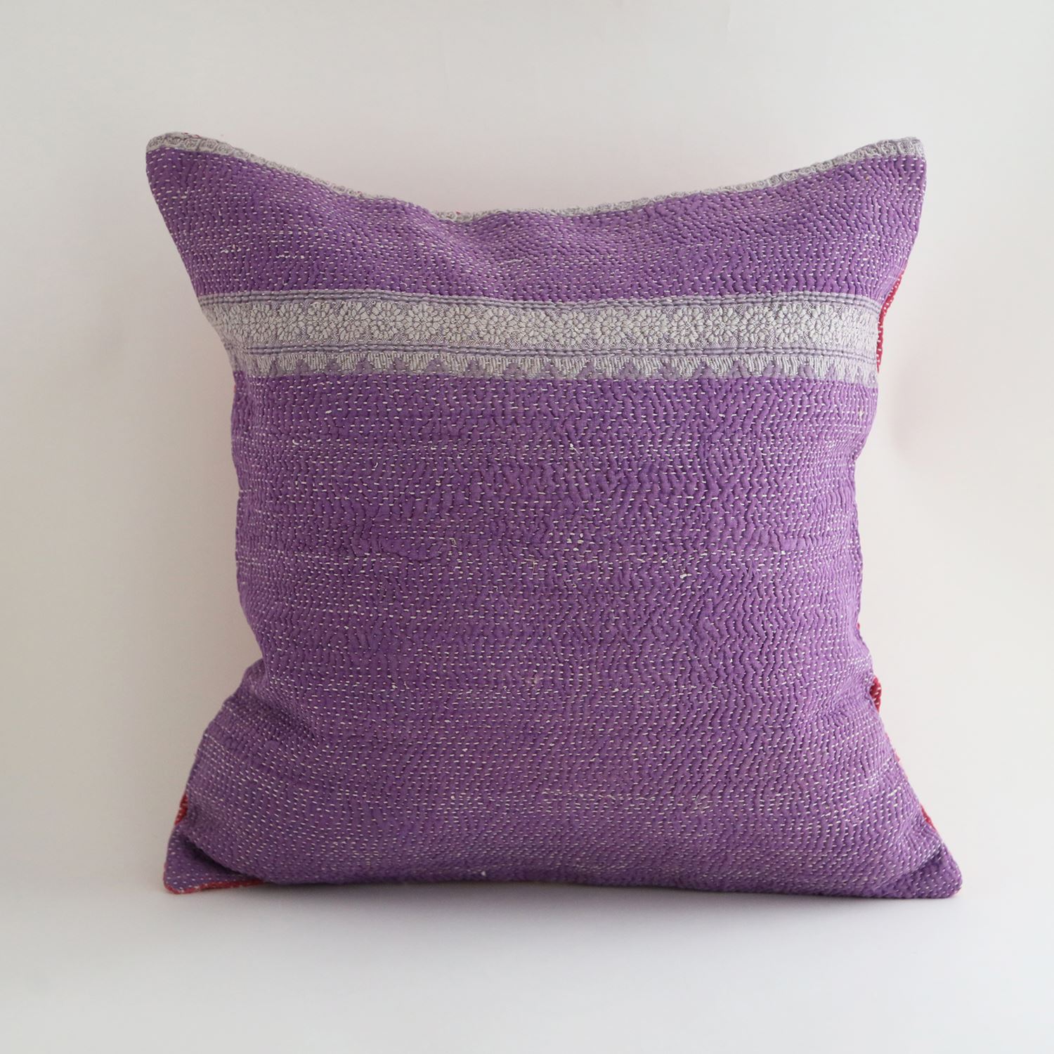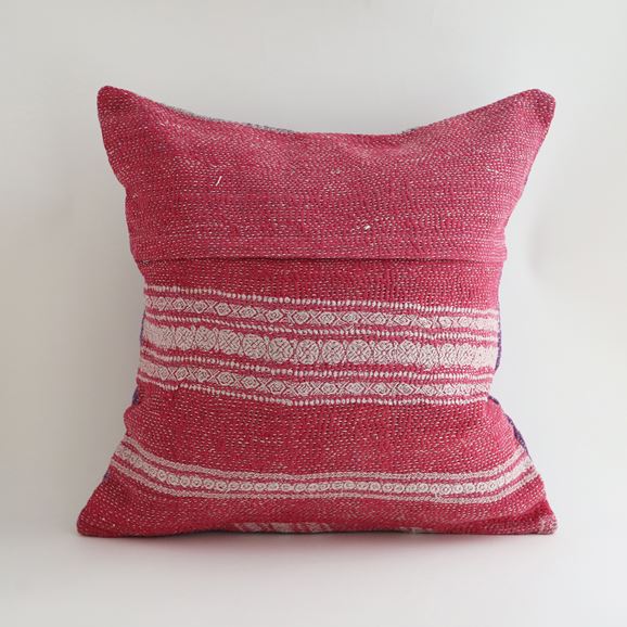 ラリーキルトを使ったクッションカバーです。ラリーキルトは、インド・パキスタンなどの中東アジアで、永い間受け継がれてきた伝統的な布です。古くなったサリーやデュパタ、腰布・古いハギレ等を貼り合わせてパッチワークし、丁寧に刺し子で合わせたもの。インダス河流域の遊牧民の家々では、嫁入り道具として母親から娘へ受け継がれています。気の遠くなるような作業を経て、わが子へ想いをこめて手渡します。一枚一枚に物語があって、何千年にも渡り母から娘へと伝えられる品。布の貼り合わせ方、刺し子の細やかさ、生地の厚みや柄など1つとして同じものはありません。丁寧にハンドメイドで作られているからこその味わいと魅力があります。