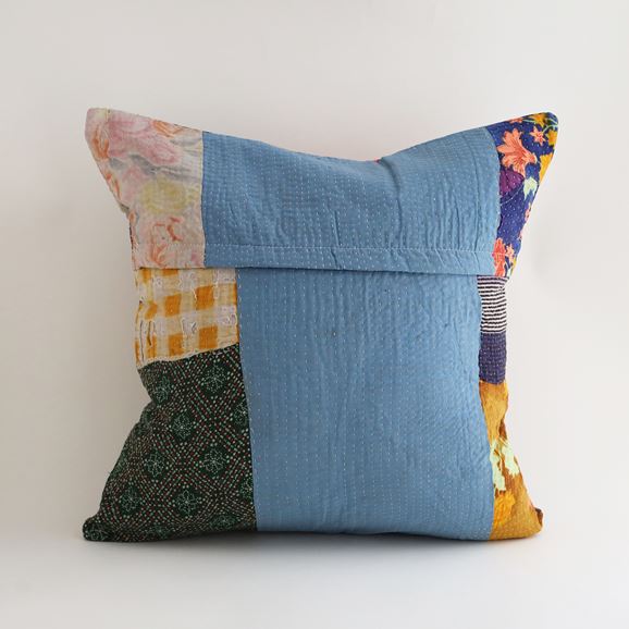 ラリーキルトを使ったクッションカバーです。ラリーキルトは、インド・パキスタンなどの中東アジアで、永い間受け継がれてきた伝統的な布です。古くなったサリーやデュパタ、腰布・古いハギレ等を貼り合わせてパッチワークし、丁寧に刺し子で合わせたもの。インダス河流域の遊牧民の家々では、嫁入り道具として母親から娘へ受け継がれています。気の遠くなるような作業を経て、わが子へ想いをこめて手渡します。一枚一枚に物語があって、何千年にも渡り母から娘へと伝えられる品。布の貼り合わせ方、刺し子の細やかさ、生地の厚みや柄など1つとして同じものはありません。丁寧にハンドメイドで作られているからこその味わいと魅力があります。