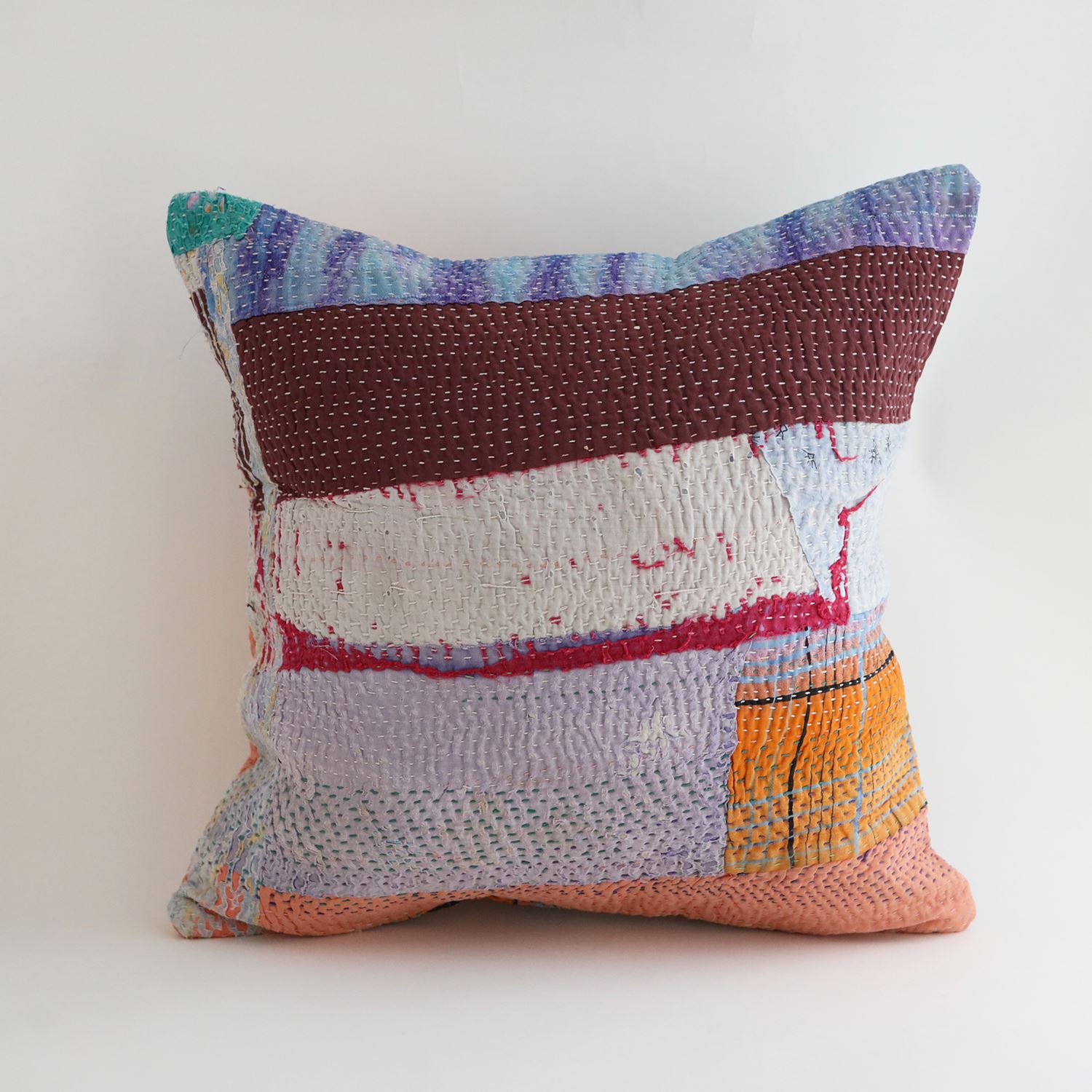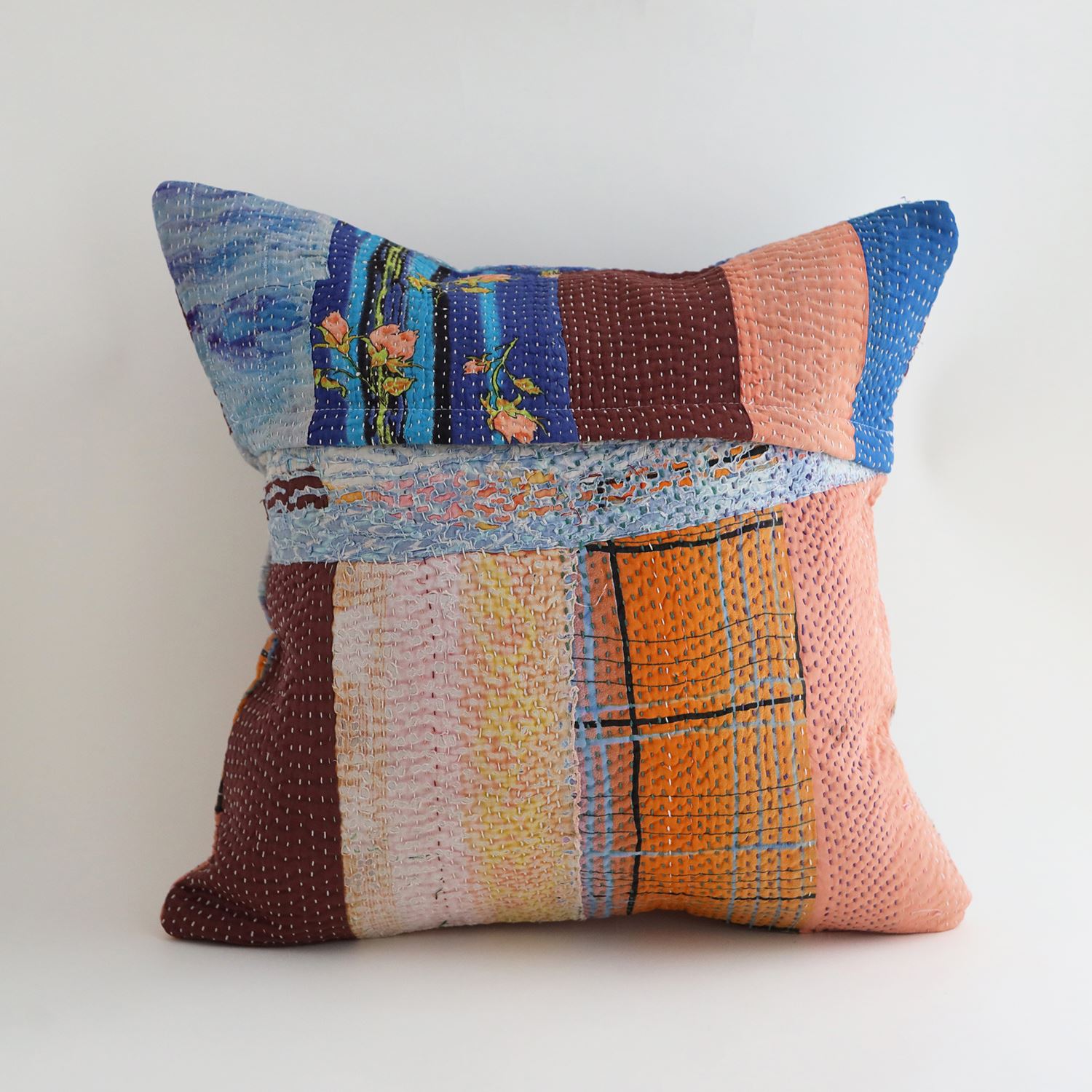 ラリーキルトを使ったクッションカバーです。ラリーキルトは、インド・パキスタンなどの中東アジアで、永い間受け継がれてきた伝統的な布です。古くなったサリーやデュパタ、腰布・古いハギレ等を貼り合わせてパッチワークし、丁寧に刺し子で合わせたもの。インダス河流域の遊牧民の家々では、嫁入り道具として母親から娘へ受け継がれています。気の遠くなるような作業を経て、わが子へ想いをこめて手渡します。一枚一枚に物語があって、何千年にも渡り母から娘へと伝えられる品。布の貼り合わせ方、刺し子の細やかさ、生地の厚みや柄など1つとして同じものはありません。丁寧にハンドメイドで作られているからこその味わいと魅力があります。