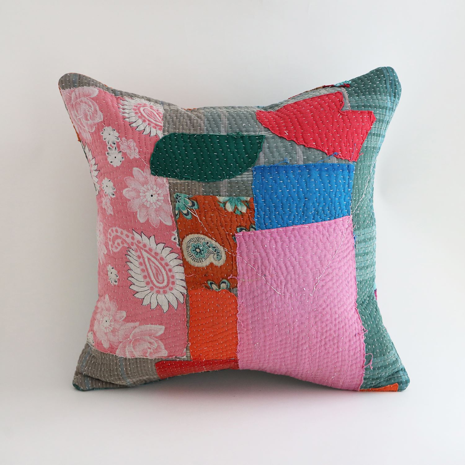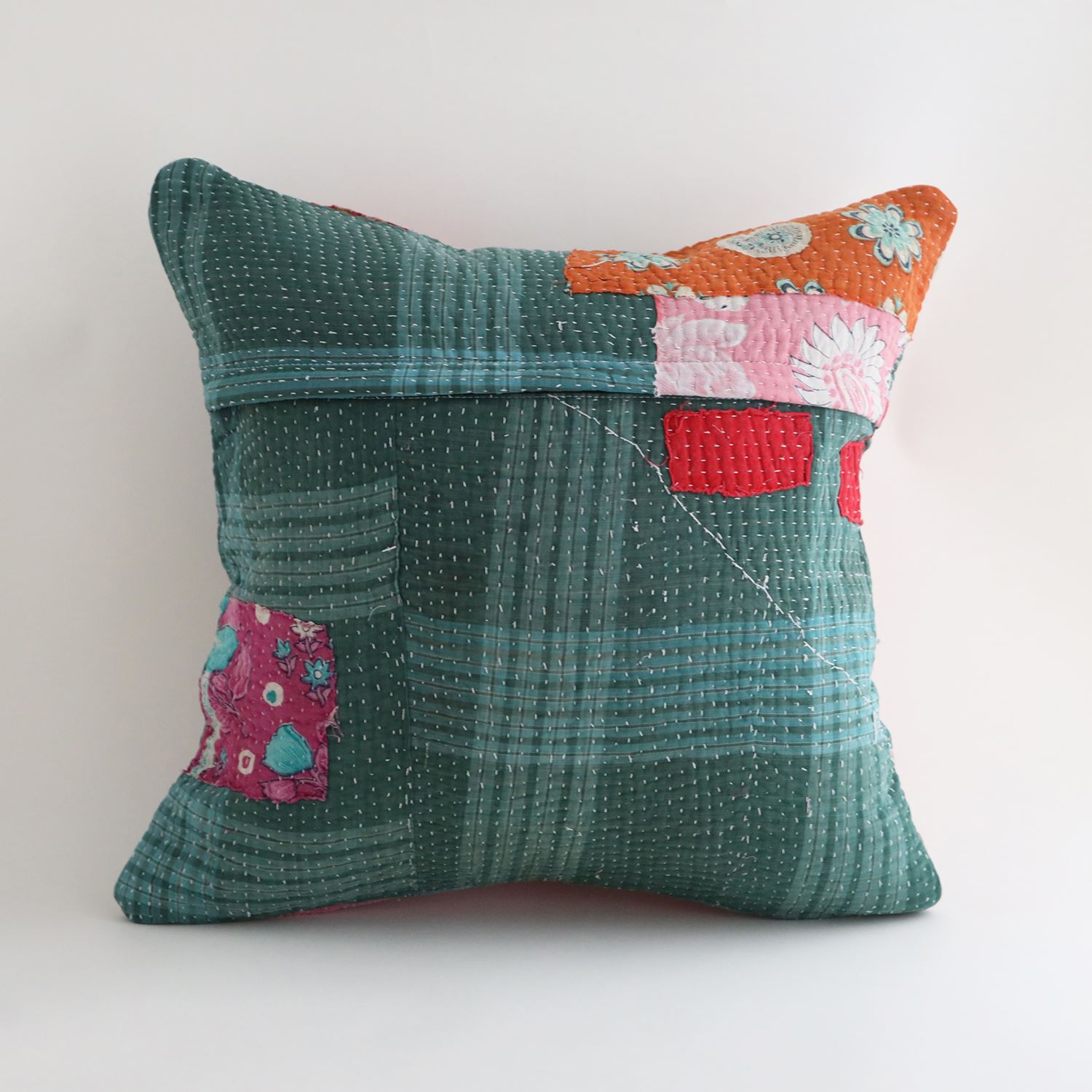 ラリーキルトを使ったクッションカバーです。ラリーキルトは、インド・パキスタンなどの中東アジアで、永い間受け継がれてきた伝統的な布です。古くなったサリーやデュパタ、腰布・古いハギレ等を貼り合わせてパッチワークし、丁寧に刺し子で合わせたもの。インダス河流域の遊牧民の家々では、嫁入り道具として母親から娘へ受け継がれています。気の遠くなるような作業を経て、わが子へ想いをこめて手渡します。一枚一枚に物語があって、何千年にも渡り母から娘へと伝えられる品。布の貼り合わせ方、刺し子の細やかさ、生地の厚みや柄など1つとして同じものはありません。丁寧にハンドメイドで作られているからこその味わいと魅力があります。