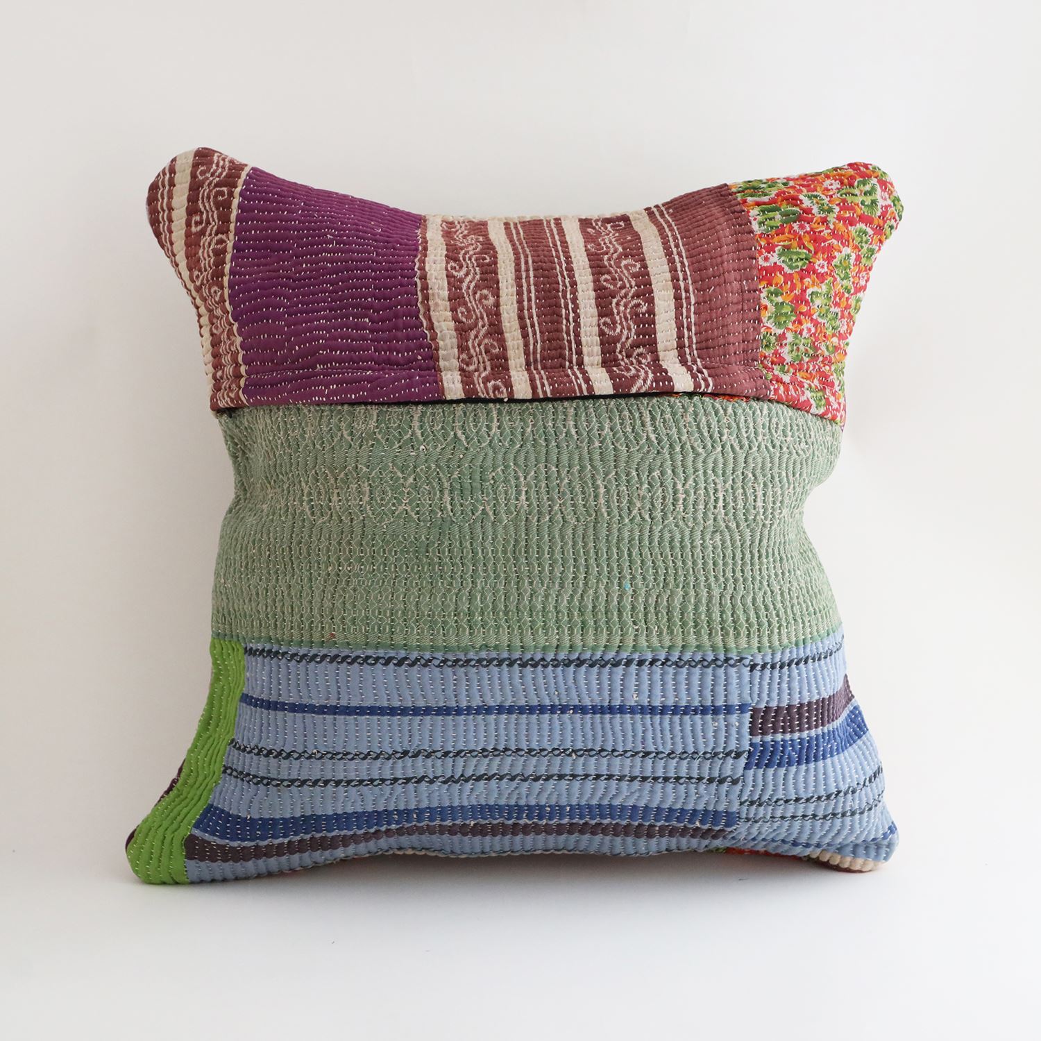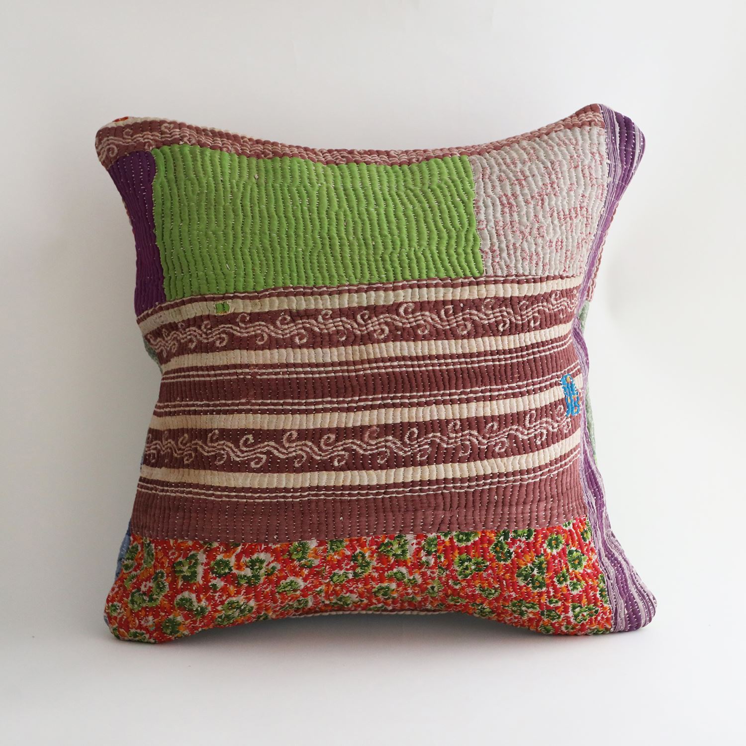 ラリーキルトを使ったクッションカバーです。ラリーキルトは、インド・パキスタンなどの中東アジアで、永い間受け継がれてきた伝統的な布です。古くなったサリーやデュパタ、腰布・古いハギレ等を貼り合わせてパッチワークし、丁寧に刺し子で合わせたもの。インダス河流域の遊牧民の家々では、嫁入り道具として母親から娘へ受け継がれています。気の遠くなるような作業を経て、わが子へ想いをこめて手渡します。一枚一枚に物語があって、何千年にも渡り母から娘へと伝えられる品。布の貼り合わせ方、刺し子の細やかさ、生地の厚みや柄など1つとして同じものはありません。丁寧にハンドメイドで作られているからこその味わいと魅力があります。