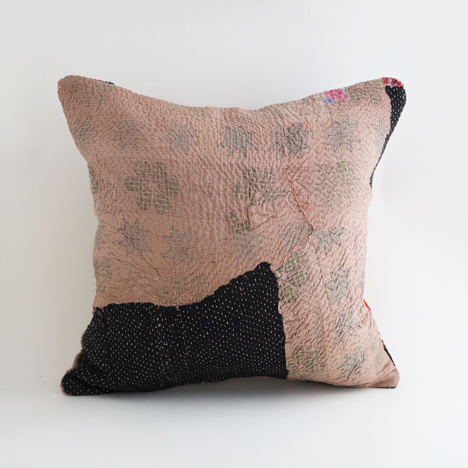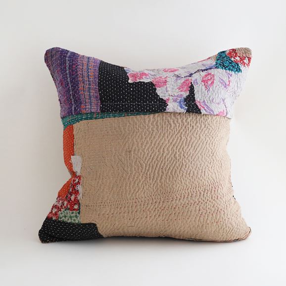 ラリーキルトを使ったクッションカバーです。ラリーキルトは、インド・パキスタンなどの中東アジアで、永い間受け継がれてきた伝統的な布です。古くなったサリーやデュパタ、腰布・古いハギレ等を貼り合わせてパッチワークし、丁寧に刺し子で合わせたもの。インダス河流域の遊牧民の家々では、嫁入り道具として母親から娘へ受け継がれています。気の遠くなるような作業を経て、わが子へ想いをこめて手渡します。一枚一枚に物語があって、何千年にも渡り母から娘へと伝えられる品。布の貼り合わせ方、刺し子の細やかさ、生地の厚みや柄など1つとして同じものはありません。丁寧にハンドメイドで作られているからこその味わいと魅力があります。