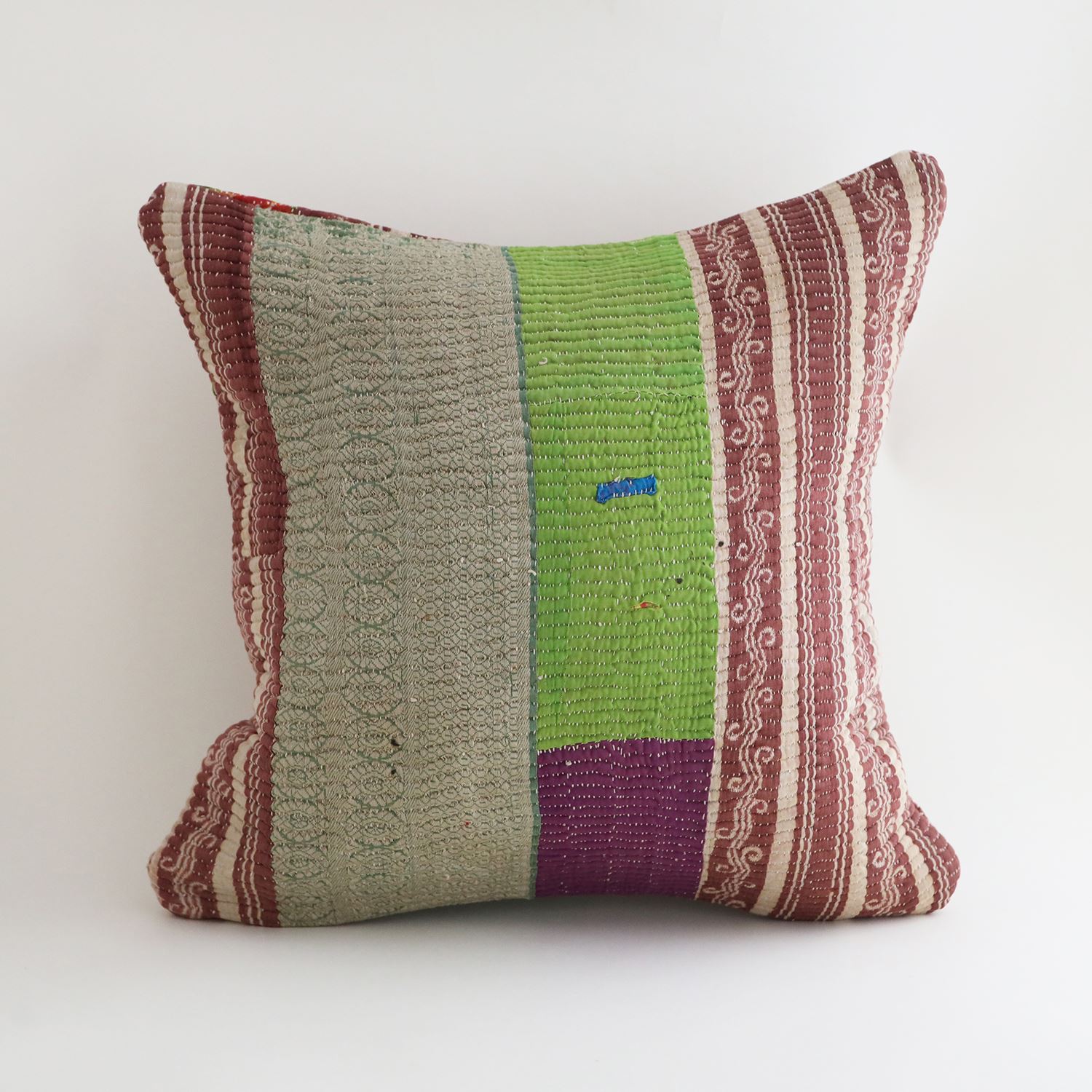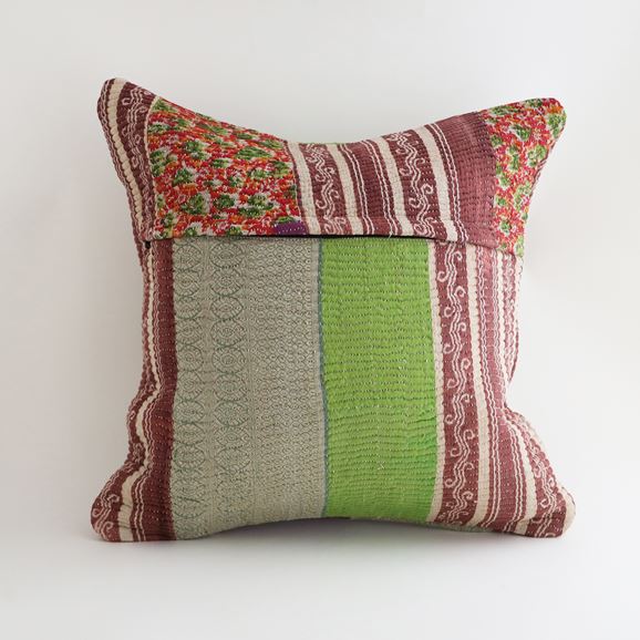ラリーキルトを使ったクッションカバーです。ラリーキルトは、インド・パキスタンなどの中東アジアで、永い間受け継がれてきた伝統的な布です。古くなったサリーやデュパタ、腰布・古いハギレ等を貼り合わせてパッチワークし、丁寧に刺し子で合わせたもの。インダス河流域の遊牧民の家々では、嫁入り道具として母親から娘へ受け継がれています。気の遠くなるような作業を経て、わが子へ想いをこめて手渡します。一枚一枚に物語があって、何千年にも渡り母から娘へと伝えられる品。布の貼り合わせ方、刺し子の細やかさ、生地の厚みや柄など1つとして同じものはありません。丁寧にハンドメイドで作られているからこその味わいと魅力があります。