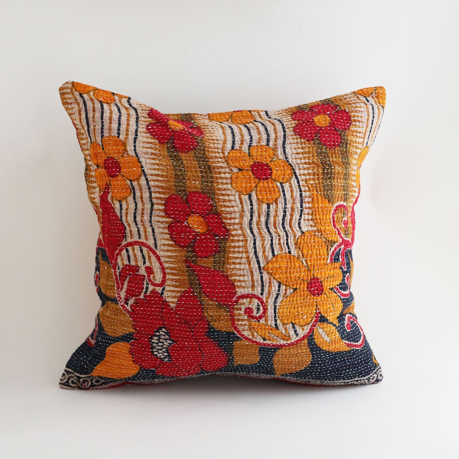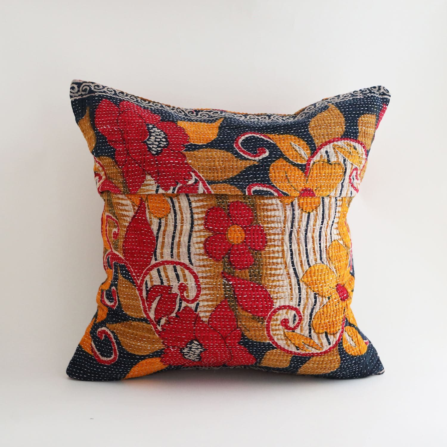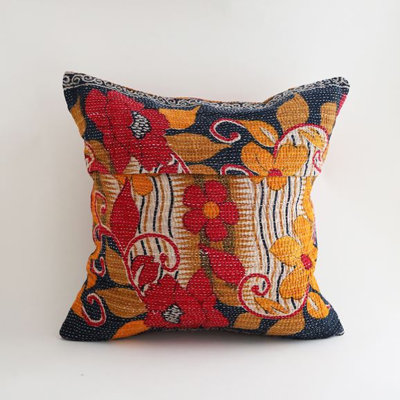 ラリーキルトを使ったクッションカバーです。ラリーキルトは、インド・パキスタンなどの中東アジアで、永い間受け継がれてきた伝統的な布です。古くなったサリーやデュパタ、腰布・古いハギレ等を貼り合わせてパッチワークし、丁寧に刺し子で合わせたもの。インダス河流域の遊牧民の家々では、嫁入り道具として母親から娘へ受け継がれています。気の遠くなるような作業を経て、わが子へ想いをこめて手渡します。一枚一枚に物語があって、何千年にも渡り母から娘へと伝えられる品。布の貼り合わせ方、刺し子の細やかさ、生地の厚みや柄など1つとして同じものはありません。丁寧にハンドメイドで作られているからこその味わいと魅力があります。