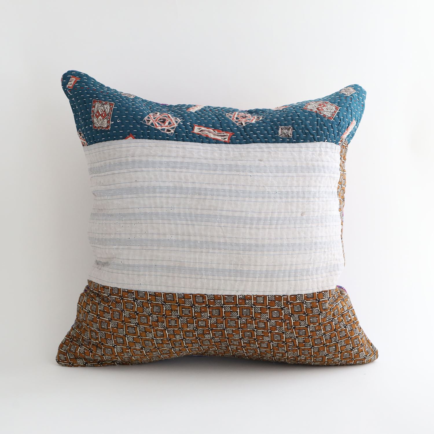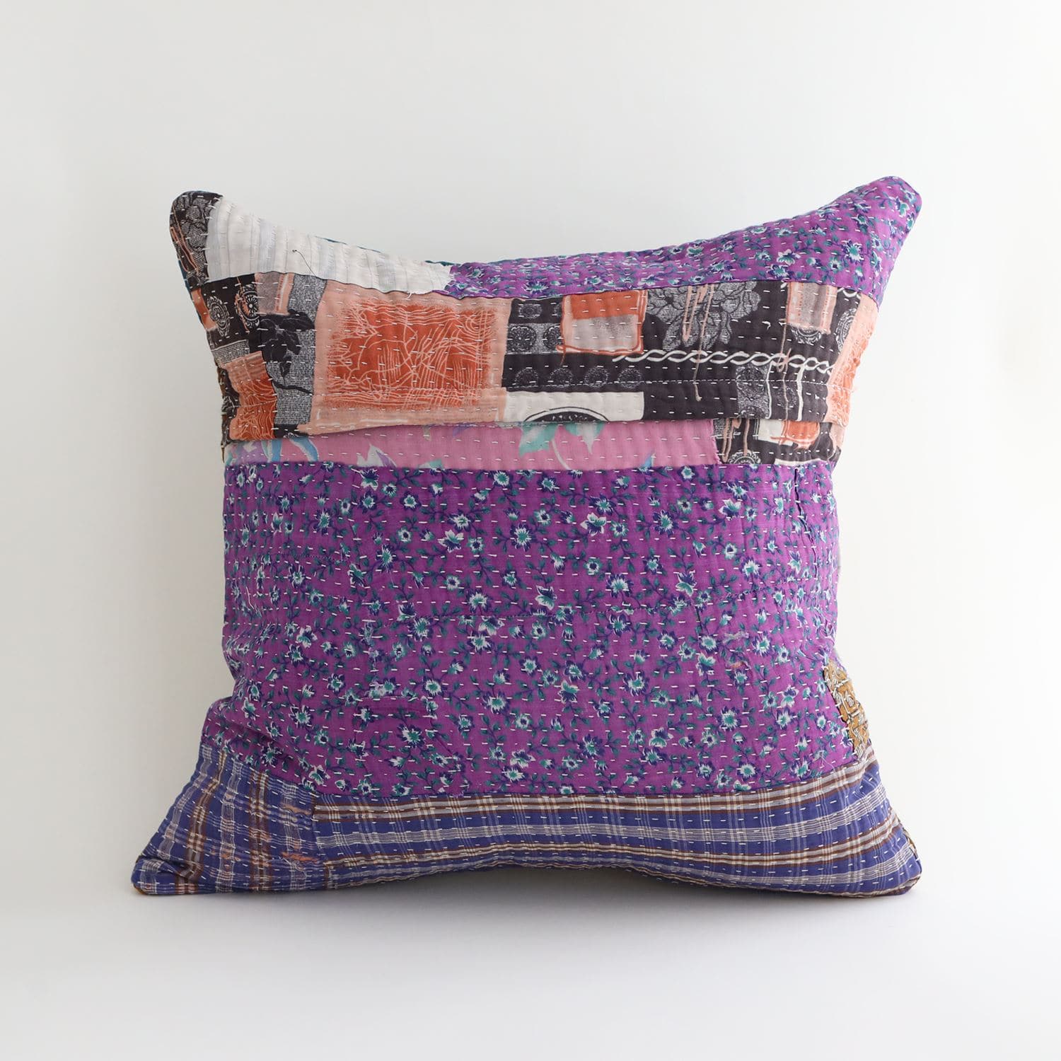 ラリーキルトを使ったクッションカバーです。ラリーキルトは、インド・パキスタンなどの中東アジアで、永い間受け継がれてきた伝統的な布です。古くなったサリーやデュパタ、腰布・古いハギレ等を貼り合わせてパッチワークし、丁寧に刺し子で合わせたもの。インダス河流域の遊牧民の家々では、嫁入り道具として母親から娘へ受け継がれています。気の遠くなるような作業を経て、わが子へ想いをこめて手渡します。一枚一枚に物語があって、何千年にも渡り母から娘へと伝えられる品。布の貼り合わせ方、刺し子の細やかさ、生地の厚みや柄など1つとして同じものはありません。丁寧にハンドメイドで作られているからこその味わいと魅力があります。