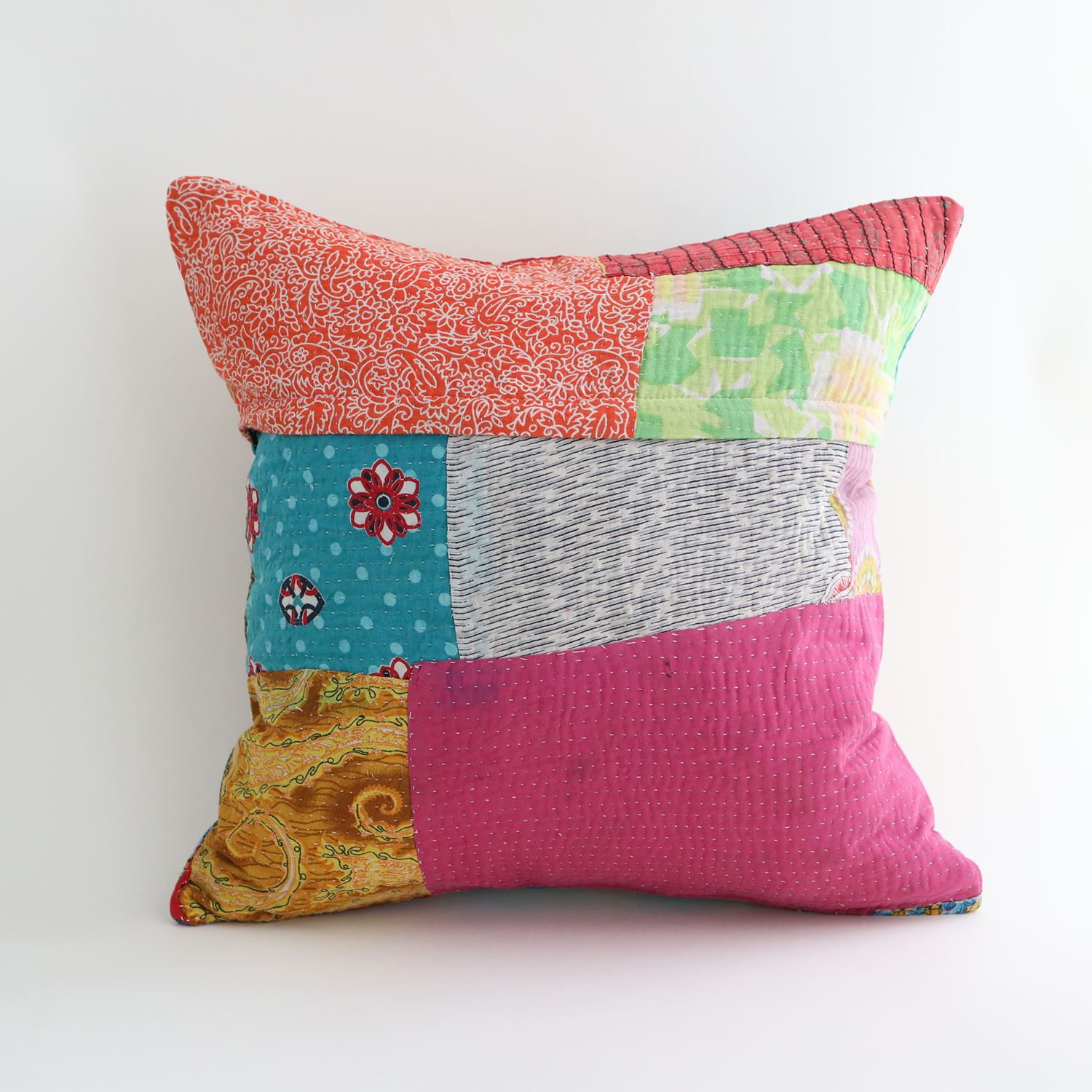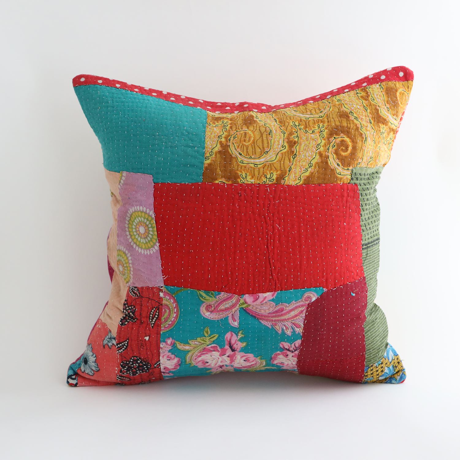 ラリーキルトを使ったクッションカバーです。ラリーキルトは、インド・パキスタンなどの中東アジアで、永い間受け継がれてきた伝統的な布です。古くなったサリーやデュパタ、腰布・古いハギレ等を貼り合わせてパッチワークし、丁寧に刺し子で合わせたもの。インダス河流域の遊牧民の家々では、嫁入り道具として母親から娘へ受け継がれています。気の遠くなるような作業を経て、わが子へ想いをこめて手渡します。一枚一枚に物語があって、何千年にも渡り母から娘へと伝えられる品。布の貼り合わせ方、刺し子の細やかさ、生地の厚みや柄など1つとして同じものはありません。丁寧にハンドメイドで作られているからこその味わいと魅力があります。