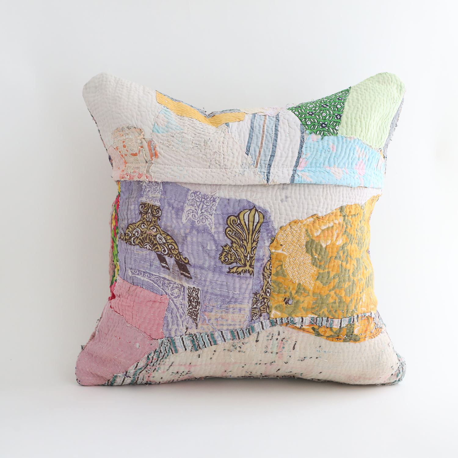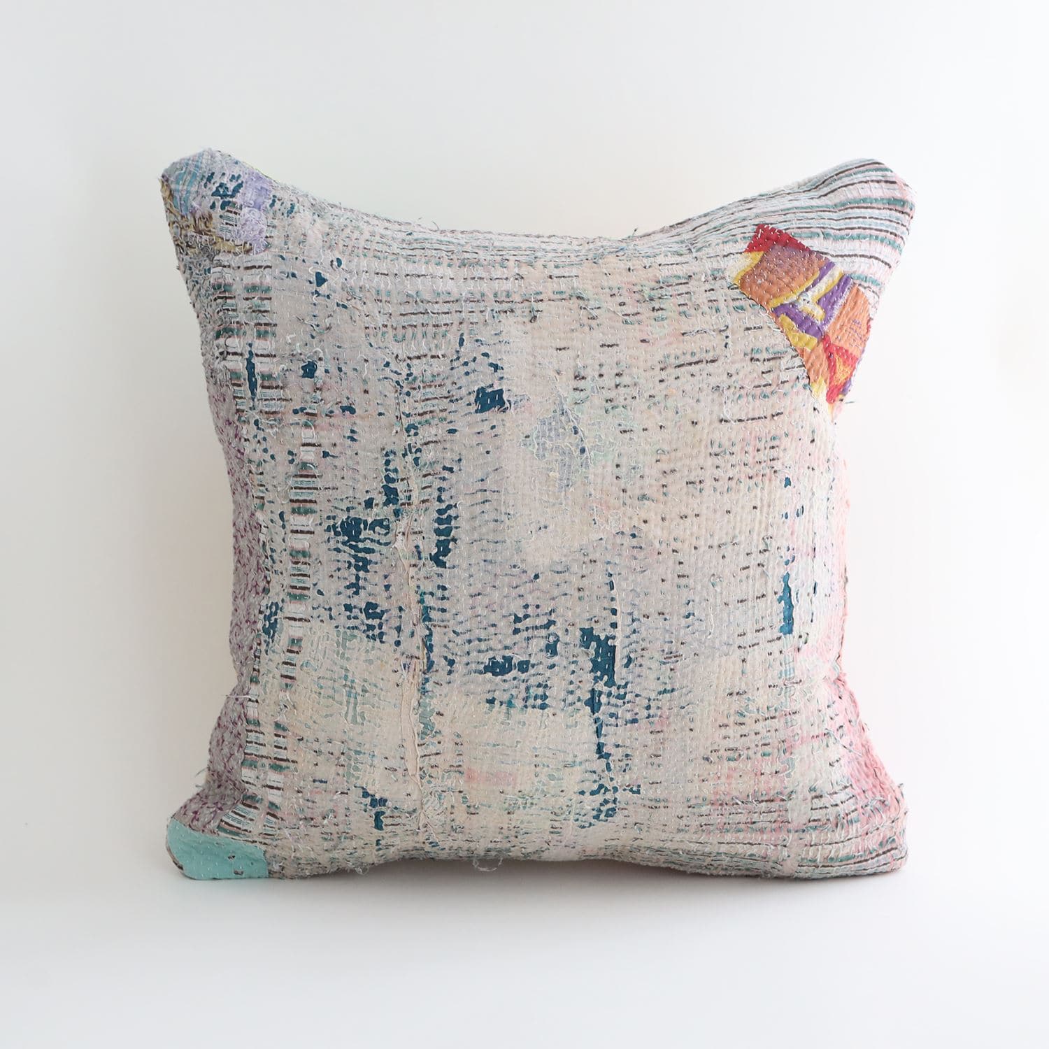 ラリーキルトを使ったクッションカバーです。ラリーキルトは、インド・パキスタンなどの中東アジアで、永い間受け継がれてきた伝統的な布です。古くなったサリーやデュパタ、腰布・古いハギレ等を貼り合わせてパッチワークし、丁寧に刺し子で合わせたもの。インダス河流域の遊牧民の家々では、嫁入り道具として母親から娘へ受け継がれています。気の遠くなるような作業を経て、わが子へ想いをこめて手渡します。一枚一枚に物語があって、何千年にも渡り母から娘へと伝えられる品。布の貼り合わせ方、刺し子の細やかさ、生地の厚みや柄など1つとして同じものはありません。丁寧にハンドメイドで作られているからこその味わいと魅力があります。