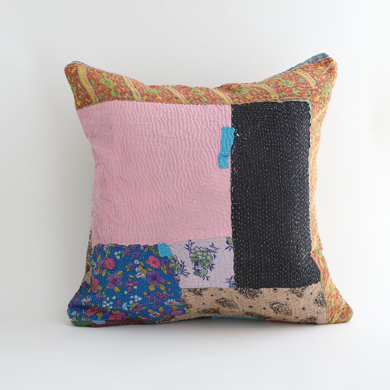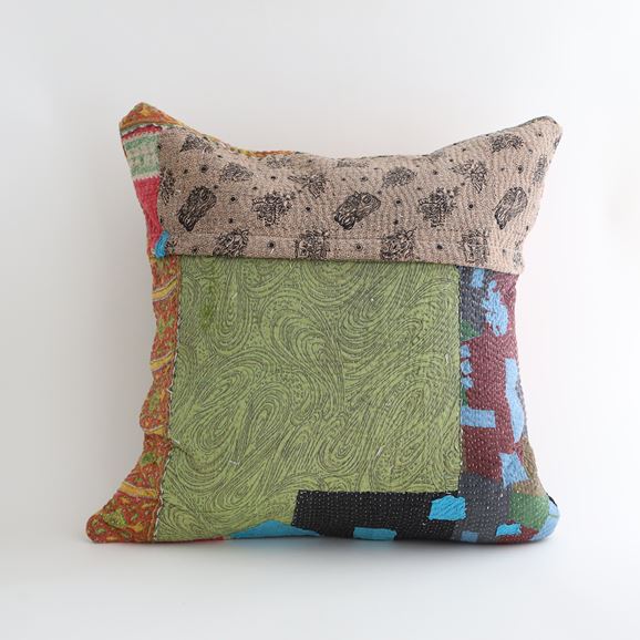 ラリーキルトを使ったクッションカバーです。ラリーキルトは、インド・パキスタンなどの中東アジアで、永い間受け継がれてきた伝統的な布です。古くなったサリーやデュパタ、腰布・古いハギレ等を貼り合わせてパッチワークし、丁寧に刺し子で合わせたもの。インダス河流域の遊牧民の家々では、嫁入り道具として母親から娘へ受け継がれています。気の遠くなるような作業を経て、わが子へ想いをこめて手渡します。一枚一枚に物語があって、何千年にも渡り母から娘へと伝えられる品。布の貼り合わせ方、刺し子の細やかさ、生地の厚みや柄など1つとして同じものはありません。丁寧にハンドメイドで作られているからこその味わいと魅力があります。