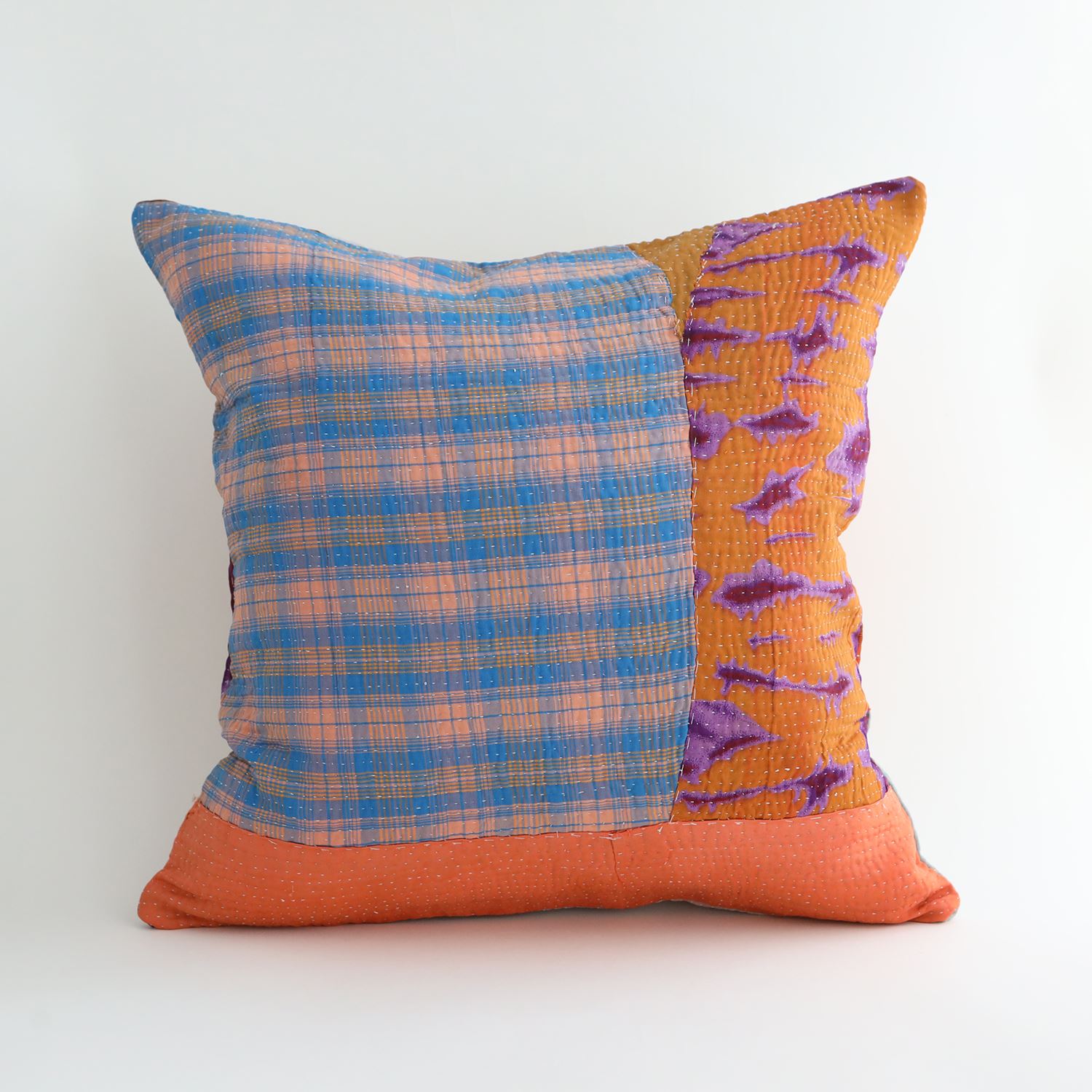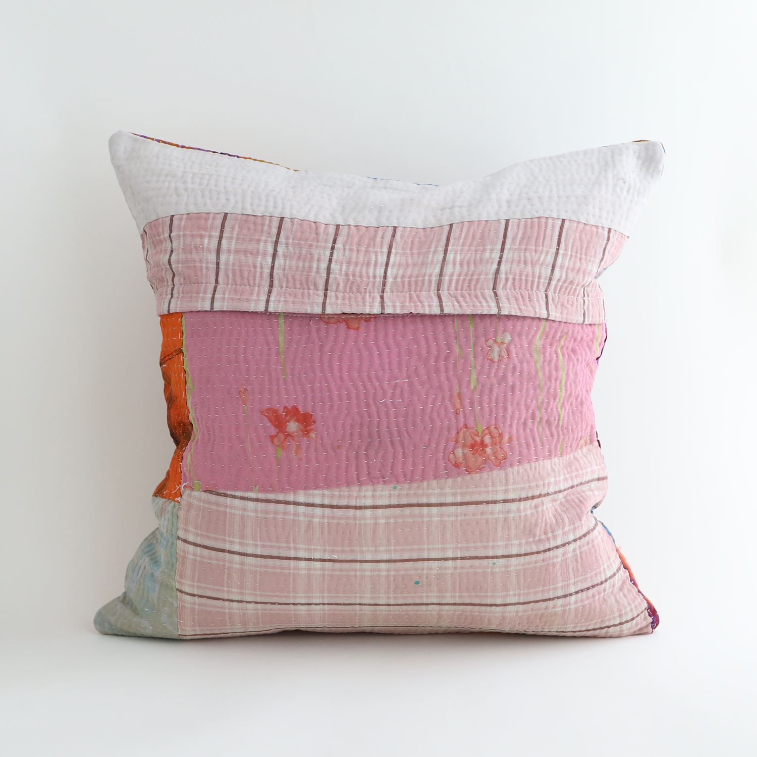 ラリーキルトを使ったクッションカバーです。ラリーキルトは、インド・パキスタンなどの中東アジアで、永い間受け継がれてきた伝統的な布です。古くなったサリーやデュパタ、腰布・古いハギレ等を貼り合わせてパッチワークし、丁寧に刺し子で合わせたもの。インダス河流域の遊牧民の家々では、嫁入り道具として母親から娘へ受け継がれています。気の遠くなるような作業を経て、わが子へ想いをこめて手渡します。一枚一枚に物語があって、何千年にも渡り母から娘へと伝えられる品。布の貼り合わせ方、刺し子の細やかさ、生地の厚みや柄など1つとして同じものはありません。丁寧にハンドメイドで作られているからこその味わいと魅力があります。