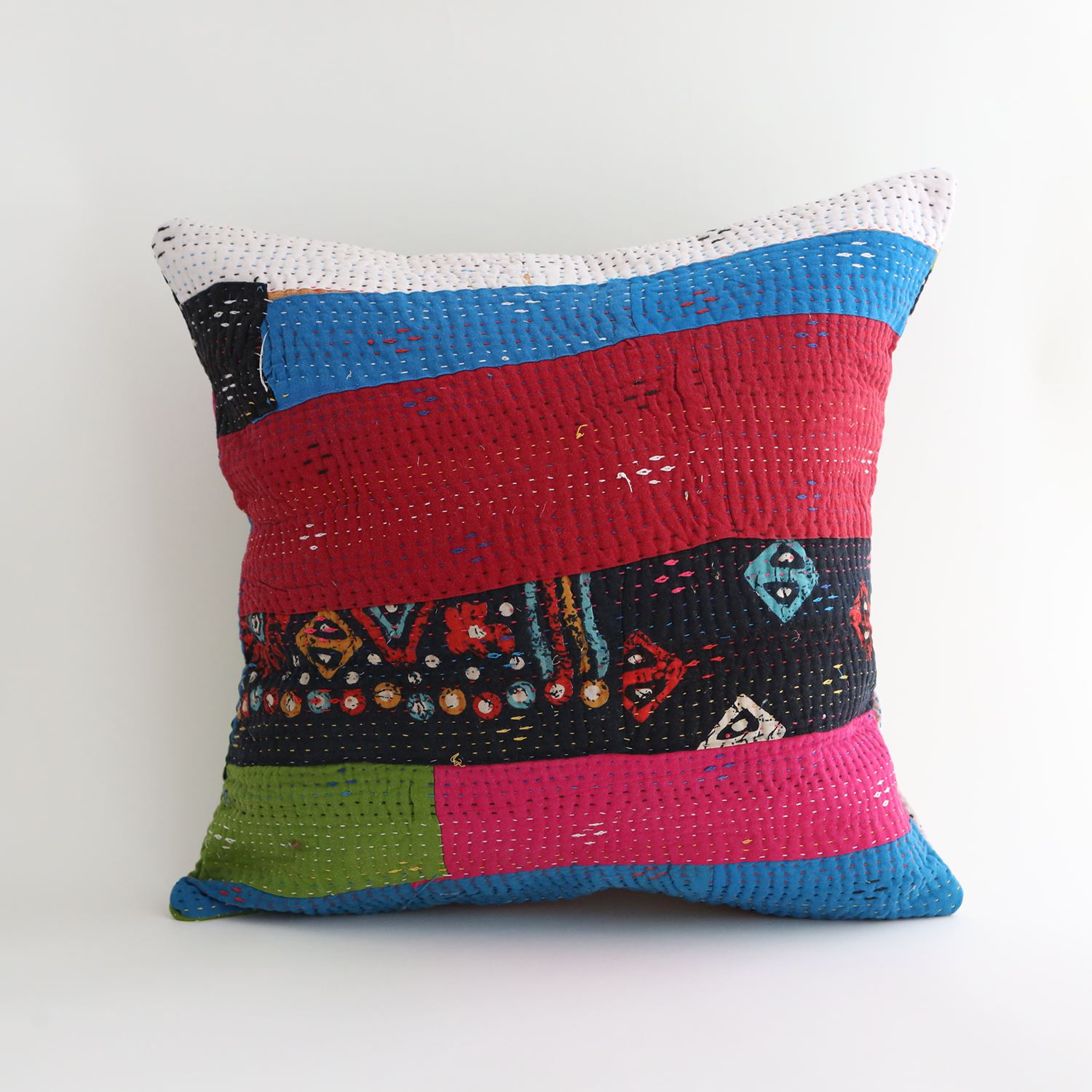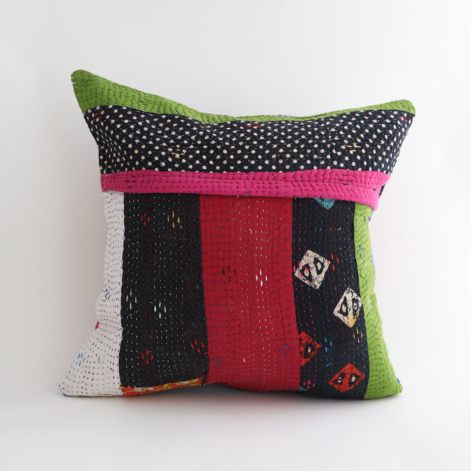 ラリーキルトを使ったクッションカバーです。ラリーキルトは、インド・パキスタンなどの中東アジアで、永い間受け継がれてきた伝統的な布です。古くなったサリーやデュパタ、腰布・古いハギレ等を貼り合わせてパッチワークし、丁寧に刺し子で合わせたもの。インダス河流域の遊牧民の家々では、嫁入り道具として母親から娘へ受け継がれています。気の遠くなるような作業を経て、わが子へ想いをこめて手渡します。一枚一枚に物語があって、何千年にも渡り母から娘へと伝えられる品。布の貼り合わせ方、刺し子の細やかさ、生地の厚みや柄など1つとして同じものはありません。丁寧にハンドメイドで作られているからこその味わいと魅力があります。