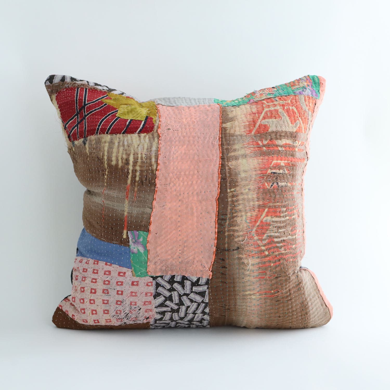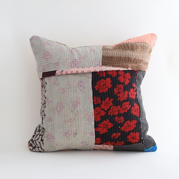 ラリーキルトを使ったクッションカバーです。ラリーキルトは、インド・パキスタンなどの中東アジアで、永い間受け継がれてきた伝統的な布です。古くなったサリーやデュパタ、腰布・古いハギレ等を貼り合わせてパッチワークし、丁寧に刺し子で合わせたもの。インダス河流域の遊牧民の家々では、嫁入り道具として母親から娘へ受け継がれています。気の遠くなるような作業を経て、わが子へ想いをこめて手渡します。一枚一枚に物語があって、何千年にも渡り母から娘へと伝えられる品。布の貼り合わせ方、刺し子の細やかさ、生地の厚みや柄など1つとして同じものはありません。丁寧にハンドメイドで作られているからこその味わいと魅力があります。