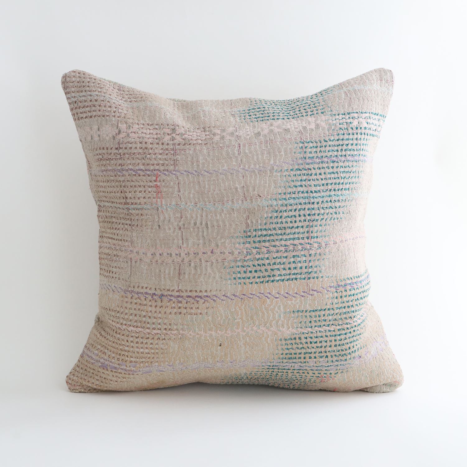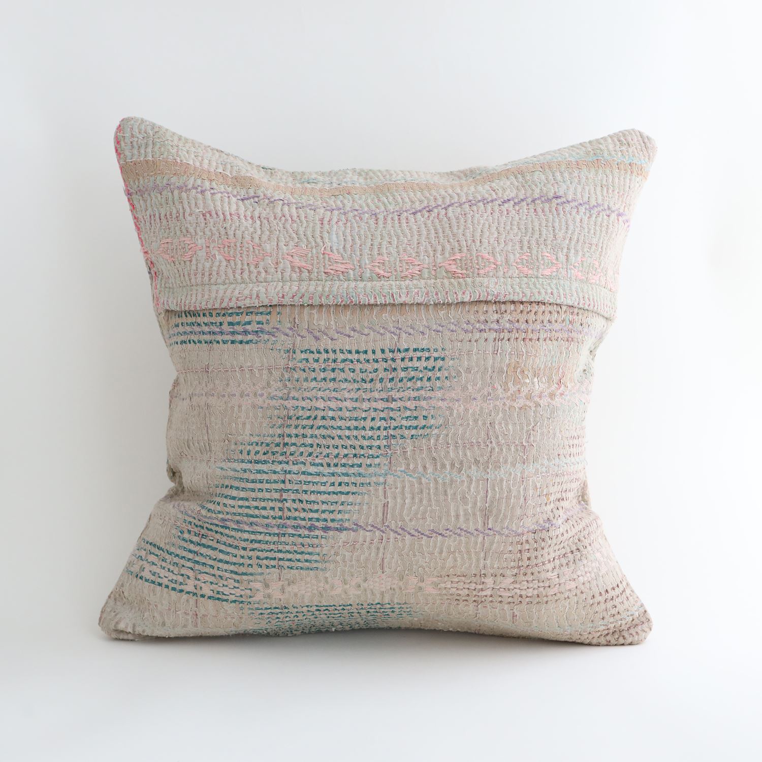 ラリーキルトを使ったクッションカバーです。ラリーキルトは、インド・パキスタンなどの中東アジアで、永い間受け継がれてきた伝統的な布です。古くなったサリーやデュパタ、腰布・古いハギレ等を貼り合わせてパッチワークし、丁寧に刺し子で合わせたもの。インダス河流域の遊牧民の家々では、嫁入り道具として母親から娘へ受け継がれています。気の遠くなるような作業を経て、わが子へ想いをこめて手渡します。一枚一枚に物語があって、何千年にも渡り母から娘へと伝えられる品。布の貼り合わせ方、刺し子の細やかさ、生地の厚みや柄など1つとして同じものはありません。丁寧にハンドメイドで作られているからこその味わいと魅力があります。