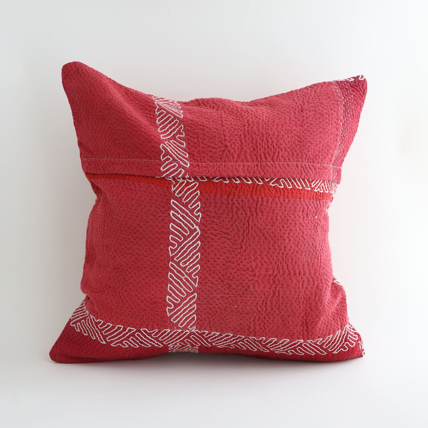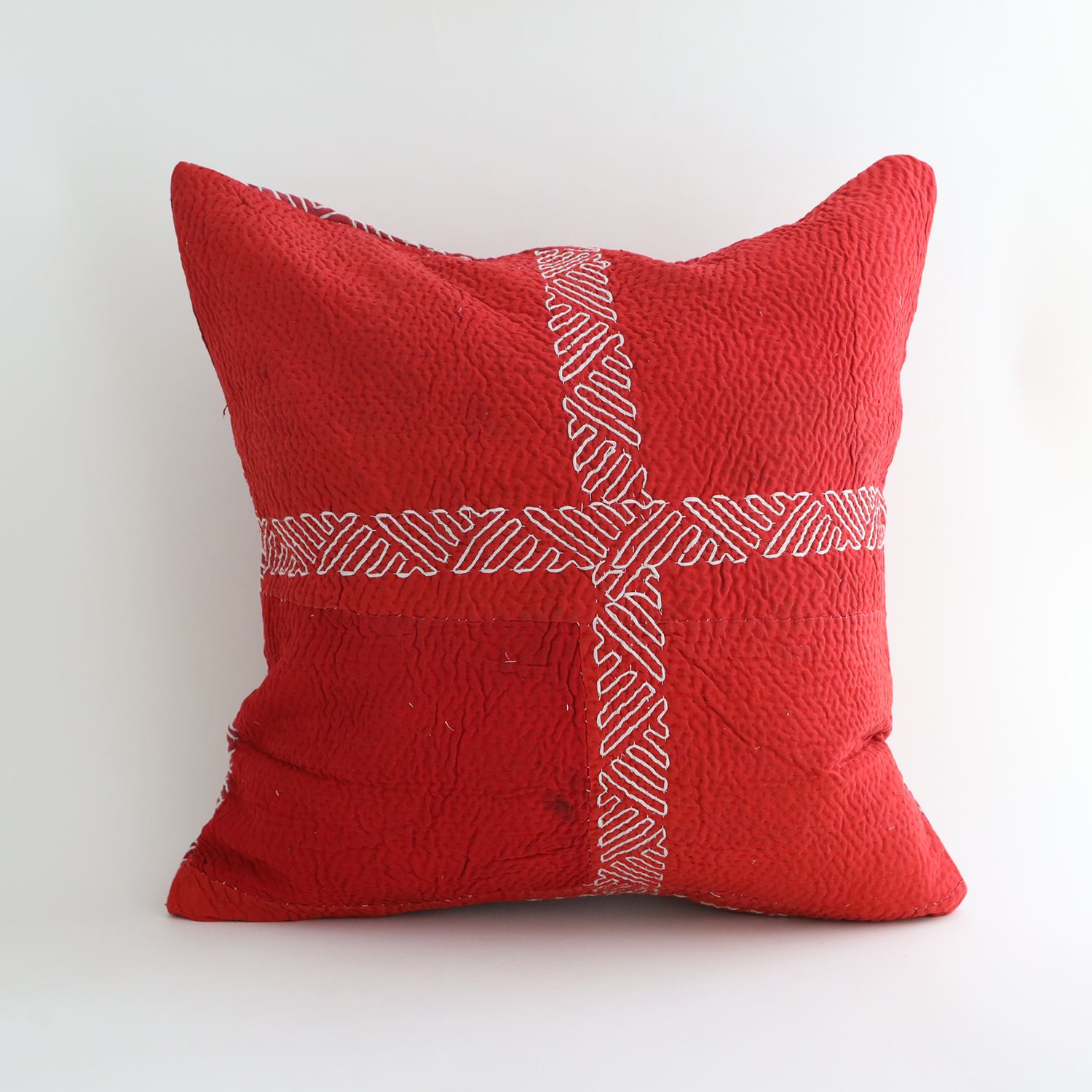 ラリーキルトを使ったクッションカバーです。ラリーキルトは、インド・パキスタンなどの中東アジアで、永い間受け継がれてきた伝統的な布です。古くなったサリーやデュパタ、腰布・古いハギレ等を貼り合わせてパッチワークし、丁寧に刺し子で合わせたもの。インダス河流域の遊牧民の家々では、嫁入り道具として母親から娘へ受け継がれています。気の遠くなるような作業を経て、わが子へ想いをこめて手渡します。一枚一枚に物語があって、何千年にも渡り母から娘へと伝えられる品。布の貼り合わせ方、刺し子の細やかさ、生地の厚みや柄など1つとして同じものはありません。丁寧にハンドメイドで作られているからこその味わいと魅力があります。