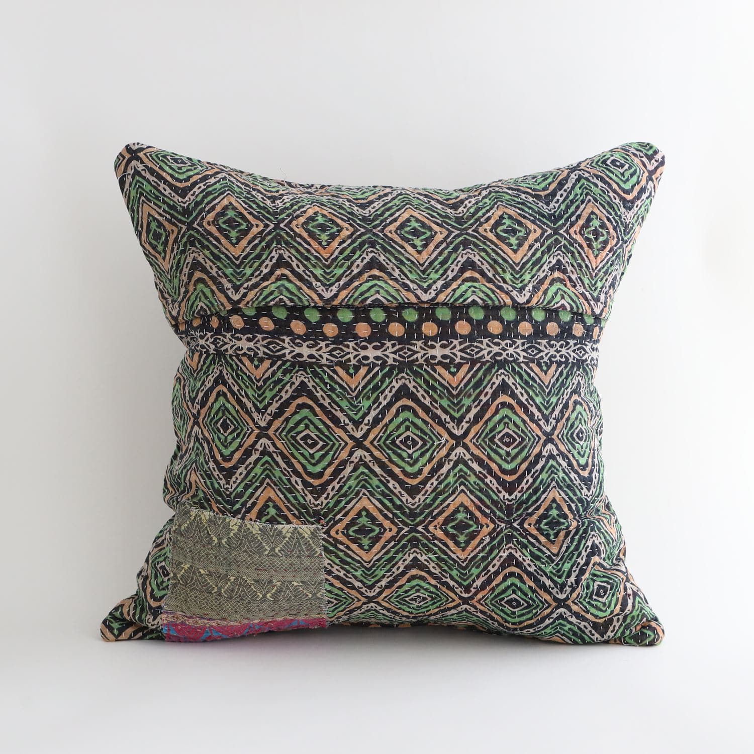 ラリーキルトを使ったクッションカバーです。ラリーキルトは、インド・パキスタンなどの中東アジアで、永い間受け継がれてきた伝統的な布です。古くなったサリーやデュパタ、腰布・古いハギレ等を貼り合わせてパッチワークし、丁寧に刺し子で合わせたもの。インダス河流域の遊牧民の家々では、嫁入り道具として母親から娘へ受け継がれています。気の遠くなるような作業を経て、わが子へ想いをこめて手渡します。一枚一枚に物語があって、何千年にも渡り母から娘へと伝えられる品。布の貼り合わせ方、刺し子の細やかさ、生地の厚みや柄など1つとして同じものはありません。丁寧にハンドメイドで作られているからこその味わいと魅力があります。