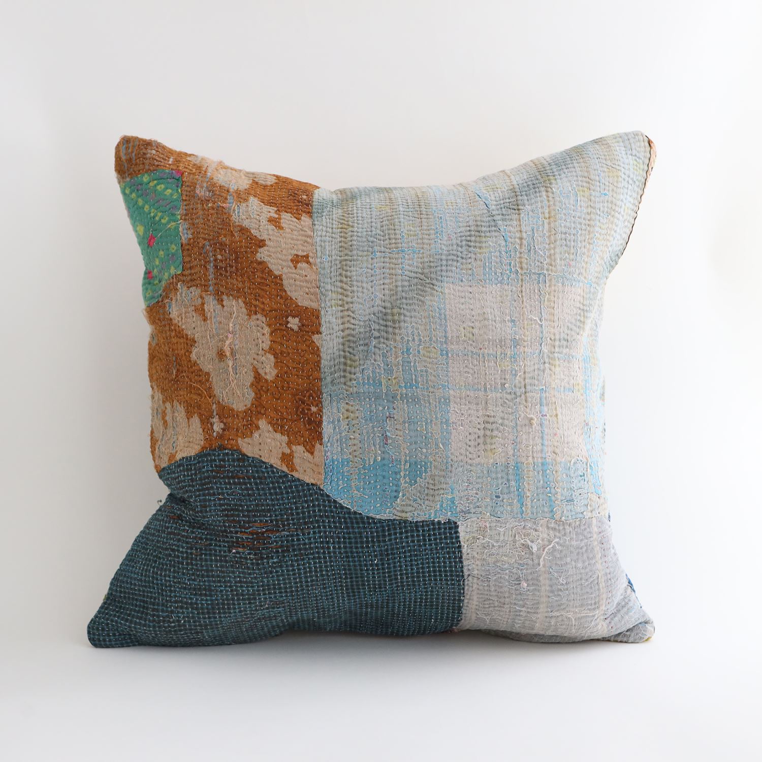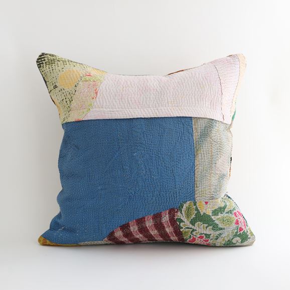 ラリーキルトを使ったクッションカバーです。ラリーキルトは、インド・パキスタンなどの中東アジアで、永い間受け継がれてきた伝統的な布です。古くなったサリーやデュパタ、腰布・古いハギレ等を貼り合わせてパッチワークし、丁寧に刺し子で合わせたもの。インダス河流域の遊牧民の家々では、嫁入り道具として母親から娘へ受け継がれています。気の遠くなるような作業を経て、わが子へ想いをこめて手渡します。一枚一枚に物語があって、何千年にも渡り母から娘へと伝えられる品。布の貼り合わせ方、刺し子の細やかさ、生地の厚みや柄など1つとして同じものはありません。丁寧にハンドメイドで作られているからこその味わいと魅力があります。