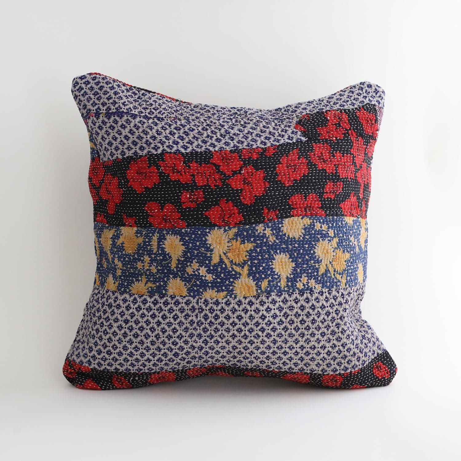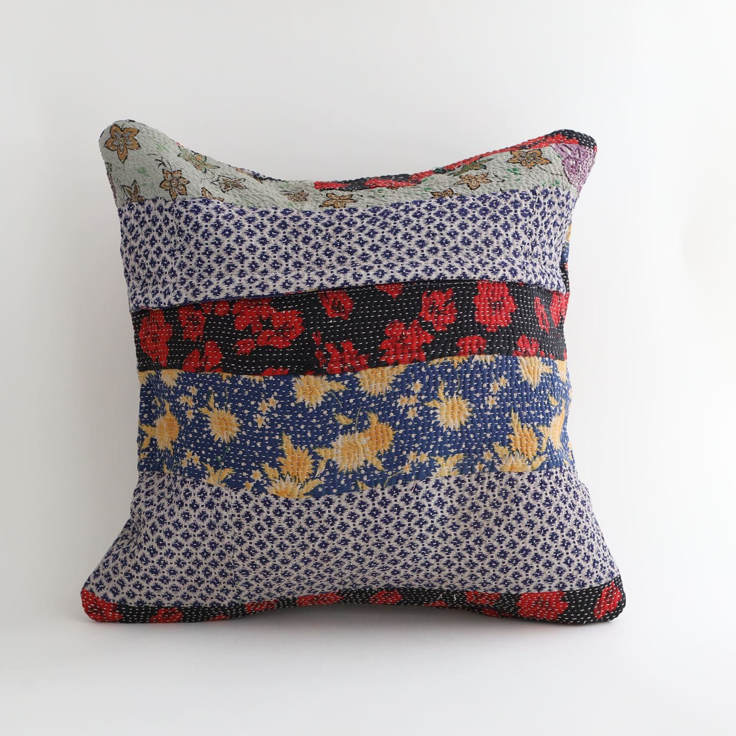 ラリーキルトを使ったクッションカバーです。ラリーキルトは、インド・パキスタンなどの中東アジアで、永い間受け継がれてきた伝統的な布です。古くなったサリーやデュパタ、腰布・古いハギレ等を貼り合わせてパッチワークし、丁寧に刺し子で合わせたもの。インダス河流域の遊牧民の家々では、嫁入り道具として母親から娘へ受け継がれています。気の遠くなるような作業を経て、わが子へ想いをこめて手渡します。一枚一枚に物語があって、何千年にも渡り母から娘へと伝えられる品。布の貼り合わせ方、刺し子の細やかさ、生地の厚みや柄など1つとして同じものはありません。丁寧にハンドメイドで作られているからこその味わいと魅力があります。