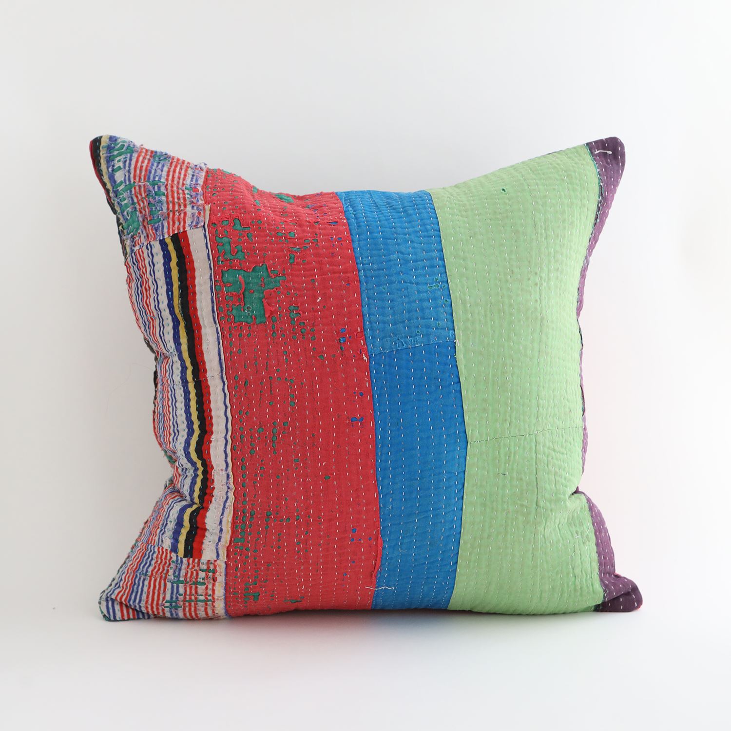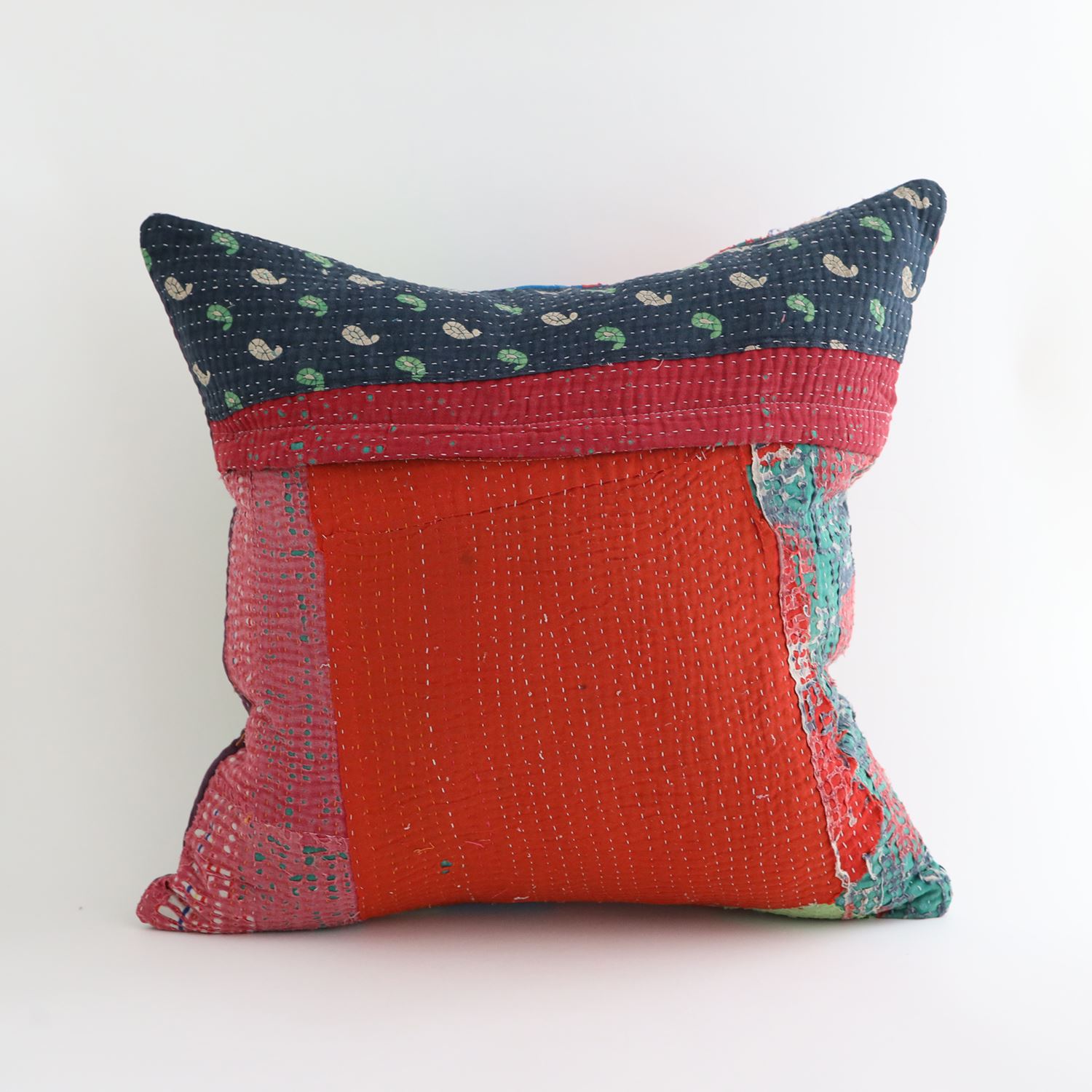 ラリーキルトを使ったクッションカバーです。ラリーキルトは、インド・パキスタンなどの中東アジアで、永い間受け継がれてきた伝統的な布です。古くなったサリーやデュパタ、腰布・古いハギレ等を貼り合わせてパッチワークし、丁寧に刺し子で合わせたもの。インダス河流域の遊牧民の家々では、嫁入り道具として母親から娘へ受け継がれています。気の遠くなるような作業を経て、わが子へ想いをこめて手渡します。一枚一枚に物語があって、何千年にも渡り母から娘へと伝えられる品。布の貼り合わせ方、刺し子の細やかさ、生地の厚みや柄など1つとして同じものはありません。丁寧にハンドメイドで作られているからこその味わいと魅力があります。