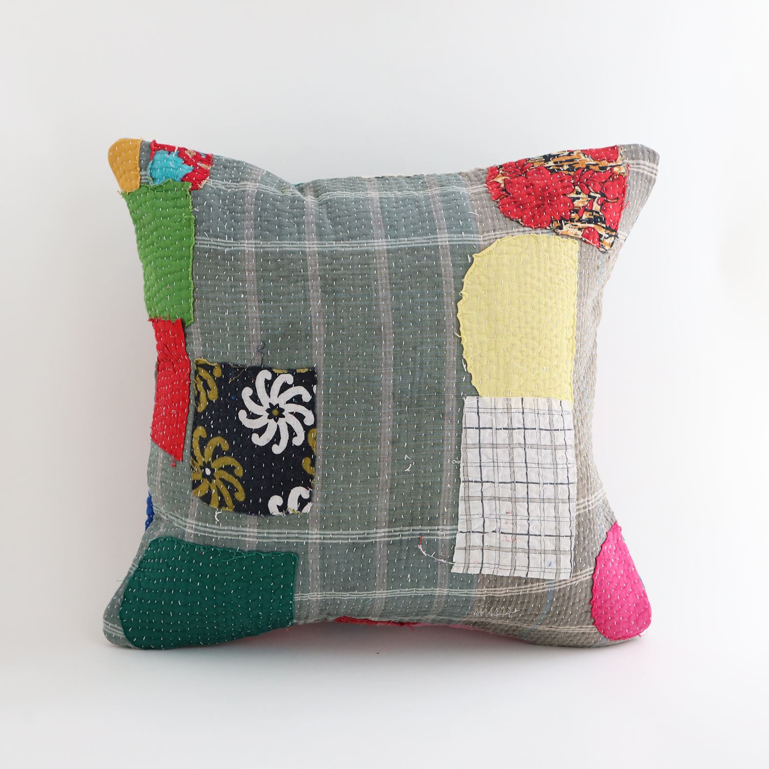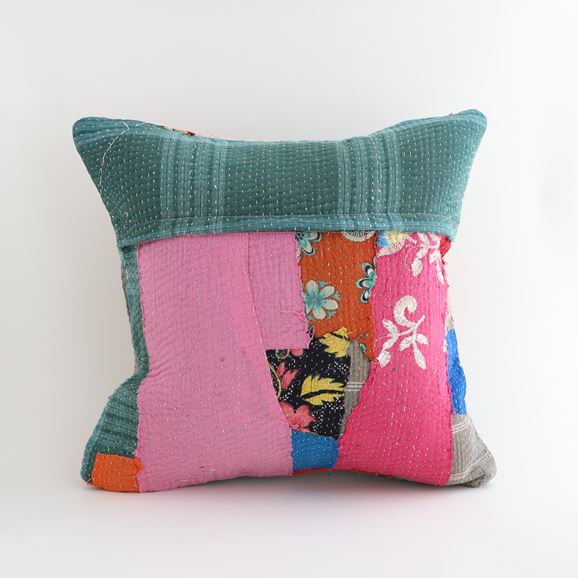ラリーキルトを使ったクッションカバーです。ラリーキルトは、インド・パキスタンなどの中東アジアで、永い間受け継がれてきた伝統的な布です。古くなったサリーやデュパタ、腰布・古いハギレ等を貼り合わせてパッチワークし、丁寧に刺し子で合わせたもの。インダス河流域の遊牧民の家々では、嫁入り道具として母親から娘へ受け継がれています。気の遠くなるような作業を経て、わが子へ想いをこめて手渡します。一枚一枚に物語があって、何千年にも渡り母から娘へと伝えられる品。布の貼り合わせ方、刺し子の細やかさ、生地の厚みや柄など1つとして同じものはありません。丁寧にハンドメイドで作られているからこその味わいと魅力があります。