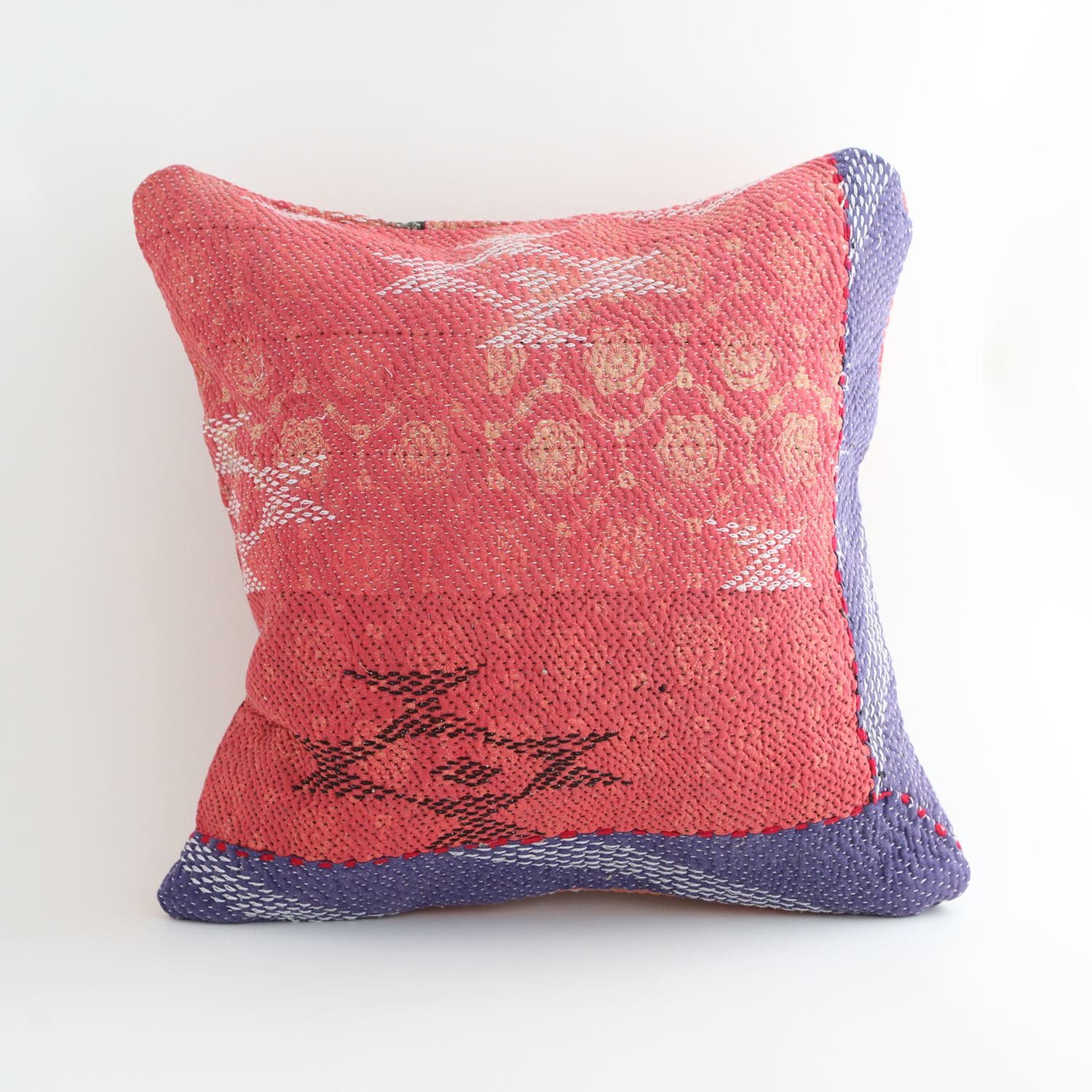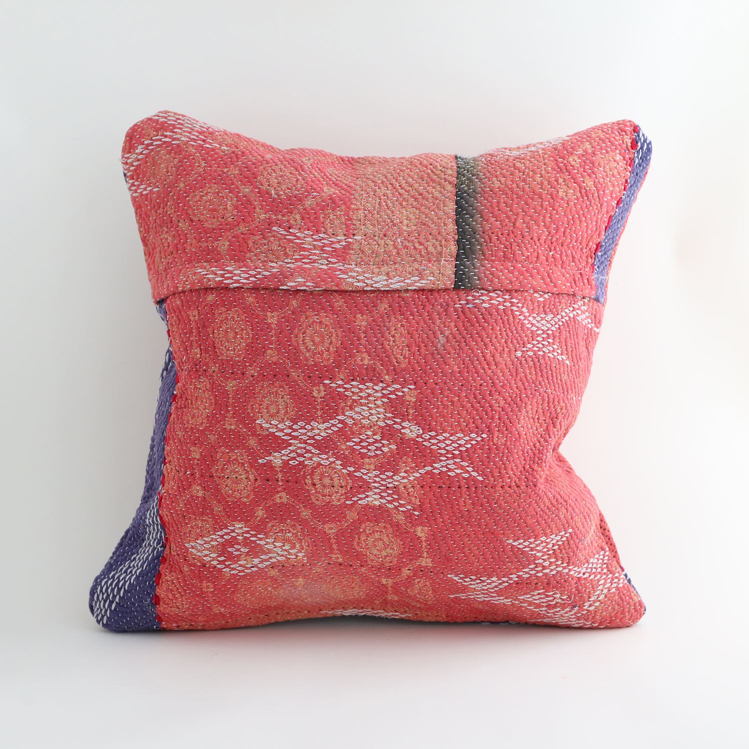 ラリーキルトを使ったクッションカバーです。ラリーキルトは、インド・パキスタンなどの中東アジアで、永い間受け継がれてきた伝統的な布です。古くなったサリーやデュパタ、腰布・古いハギレ等を貼り合わせてパッチワークし、丁寧に刺し子で合わせたもの。インダス河流域の遊牧民の家々では、嫁入り道具として母親から娘へ受け継がれています。気の遠くなるような作業を経て、わが子へ想いをこめて手渡します。一枚一枚に物語があって、何千年にも渡り母から娘へと伝えられる品。布の貼り合わせ方、刺し子の細やかさ、生地の厚みや柄など1つとして同じものはありません。丁寧にハンドメイドで作られているからこその味わいと魅力があります。