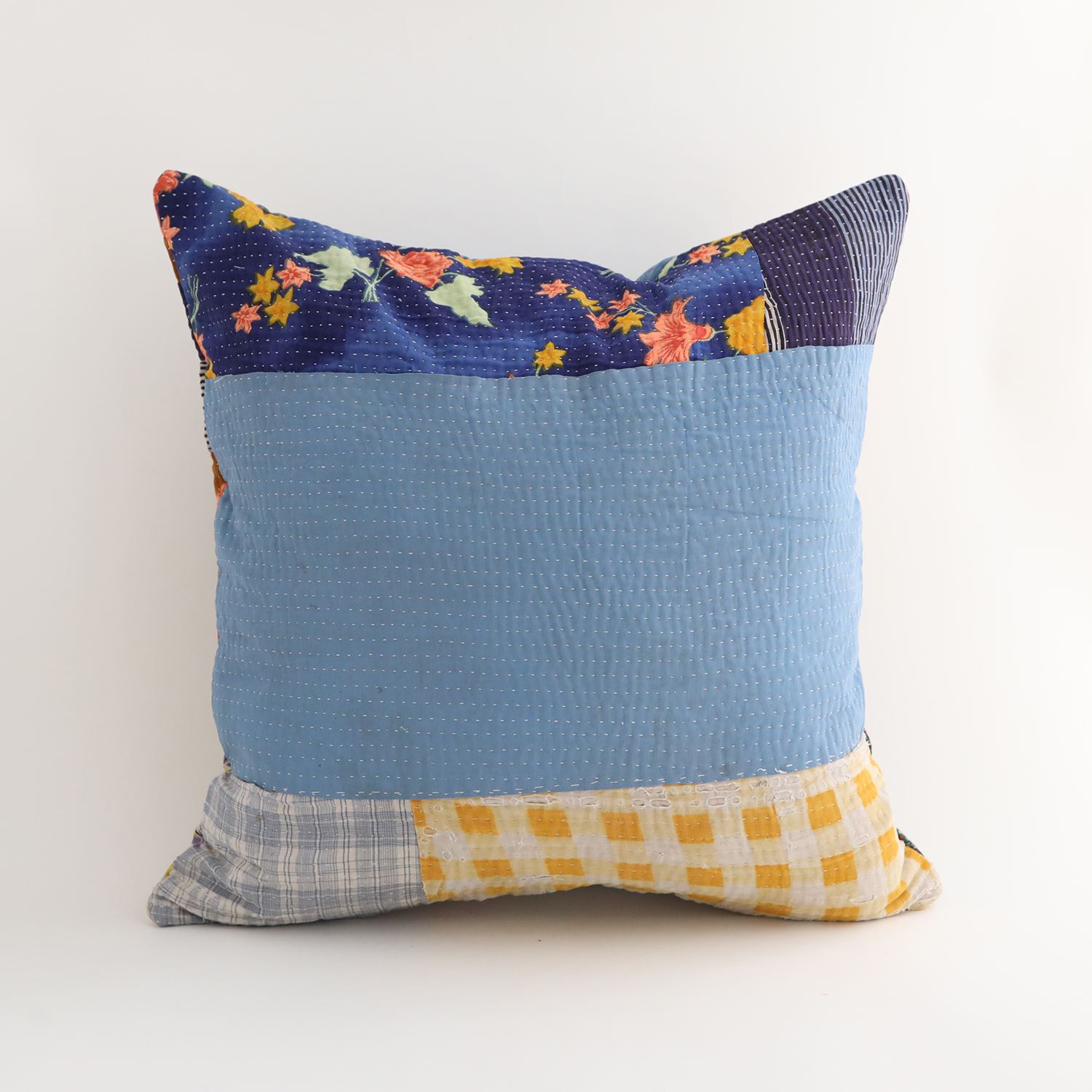 ラリーキルトを使ったクッションカバーです。ラリーキルトは、インド・パキスタンなどの中東アジアで、永い間受け継がれてきた伝統的な布です。古くなったサリーやデュパタ、腰布・古いハギレ等を貼り合わせてパッチワークし、丁寧に刺し子で合わせたもの。インダス河流域の遊牧民の家々では、嫁入り道具として母親から娘へ受け継がれています。気の遠くなるような作業を経て、わが子へ想いをこめて手渡します。一枚一枚に物語があって、何千年にも渡り母から娘へと伝えられる品。布の貼り合わせ方、刺し子の細やかさ、生地の厚みや柄など1つとして同じものはありません。丁寧にハンドメイドで作られているからこその味わいと魅力があります。