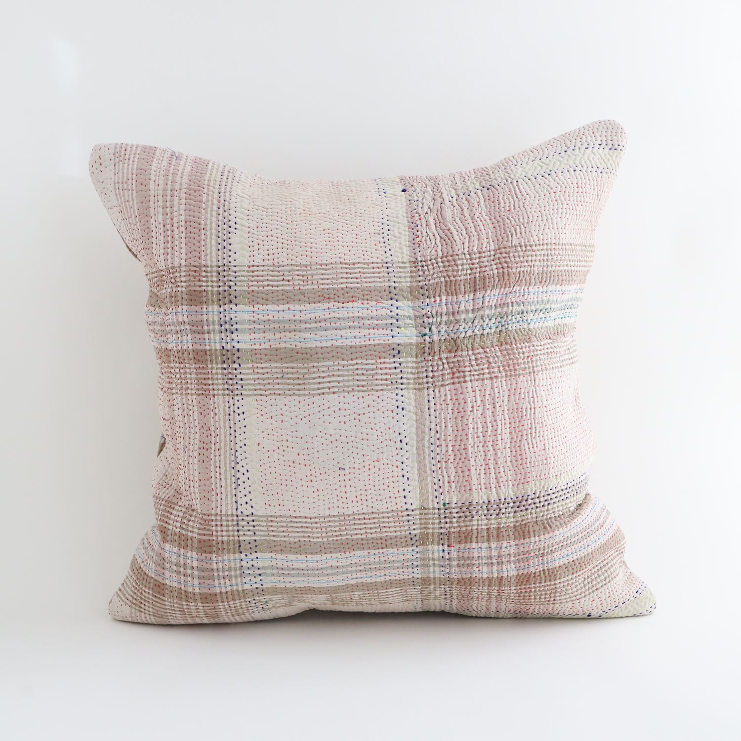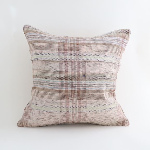 ラリーキルトを使ったクッションカバーです。ラリーキルトは、インド・パキスタンなどの中東アジアで、永い間受け継がれてきた伝統的な布です。古くなったサリーやデュパタ、腰布・古いハギレ等を貼り合わせてパッチワークし、丁寧に刺し子で合わせたもの。インダス河流域の遊牧民の家々では、嫁入り道具として母親から娘へ受け継がれています。気の遠くなるような作業を経て、わが子へ想いをこめて手渡します。一枚一枚に物語があって、何千年にも渡り母から娘へと伝えられる品。布の貼り合わせ方、刺し子の細やかさ、生地の厚みや柄など1つとして同じものはありません。丁寧にハンドメイドで作られているからこその味わいと魅力があります。