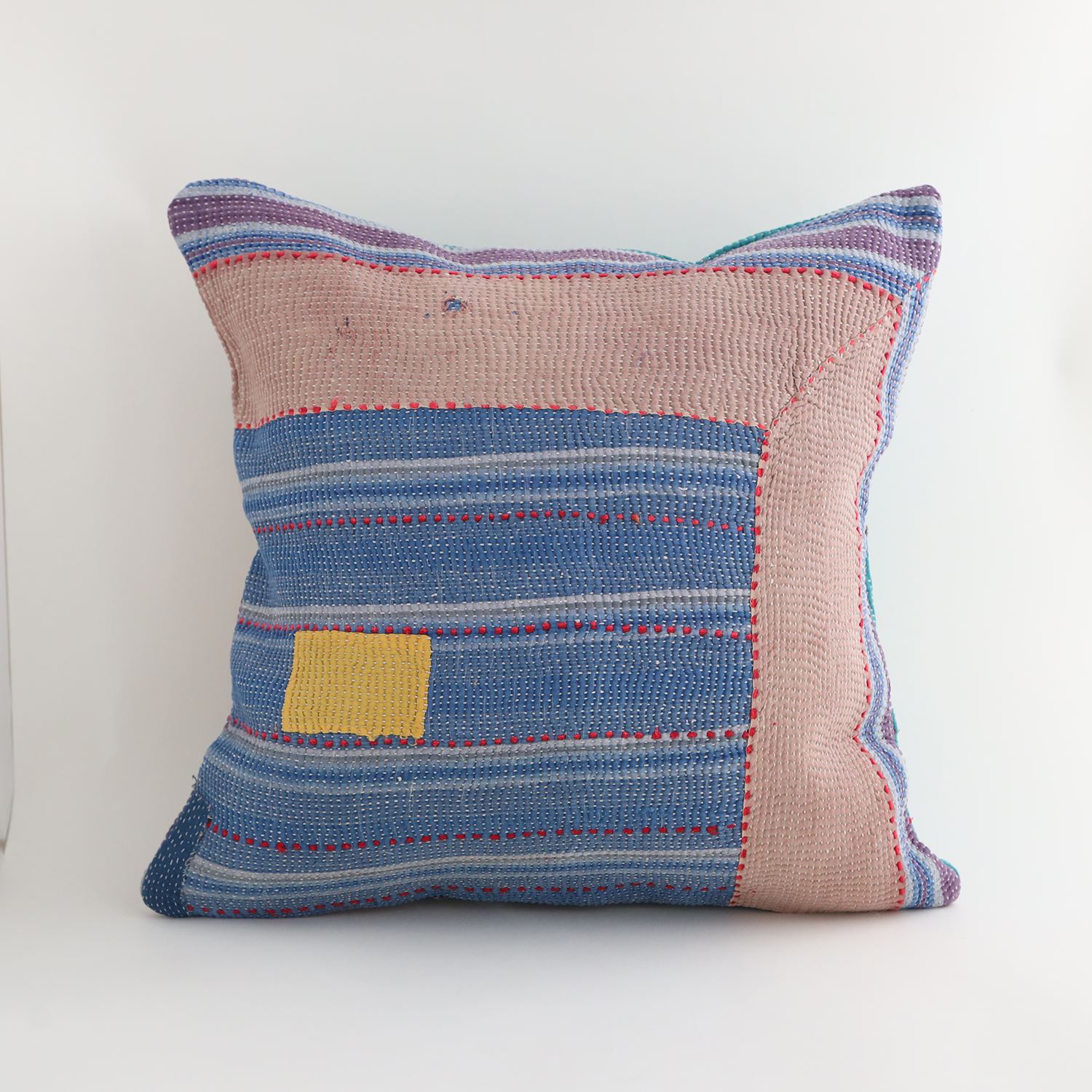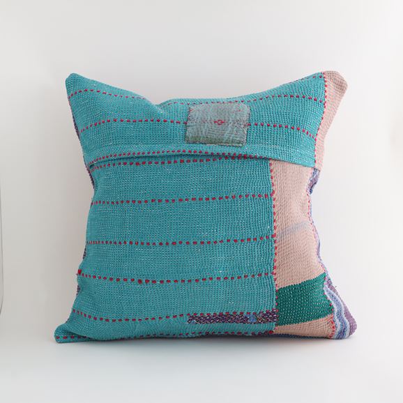 ラリーキルトを使ったクッションカバーです。ラリーキルトは、インド・パキスタンなどの中東アジアで、永い間受け継がれてきた伝統的な布です。古くなったサリーやデュパタ、腰布・古いハギレ等を貼り合わせてパッチワークし、丁寧に刺し子で合わせたもの。インダス河流域の遊牧民の家々では、嫁入り道具として母親から娘へ受け継がれています。気の遠くなるような作業を経て、わが子へ想いをこめて手渡します。一枚一枚に物語があって、何千年にも渡り母から娘へと伝えられる品。布の貼り合わせ方、刺し子の細やかさ、生地の厚みや柄など1つとして同じものはありません。丁寧にハンドメイドで作られているからこその味わいと魅力があります。