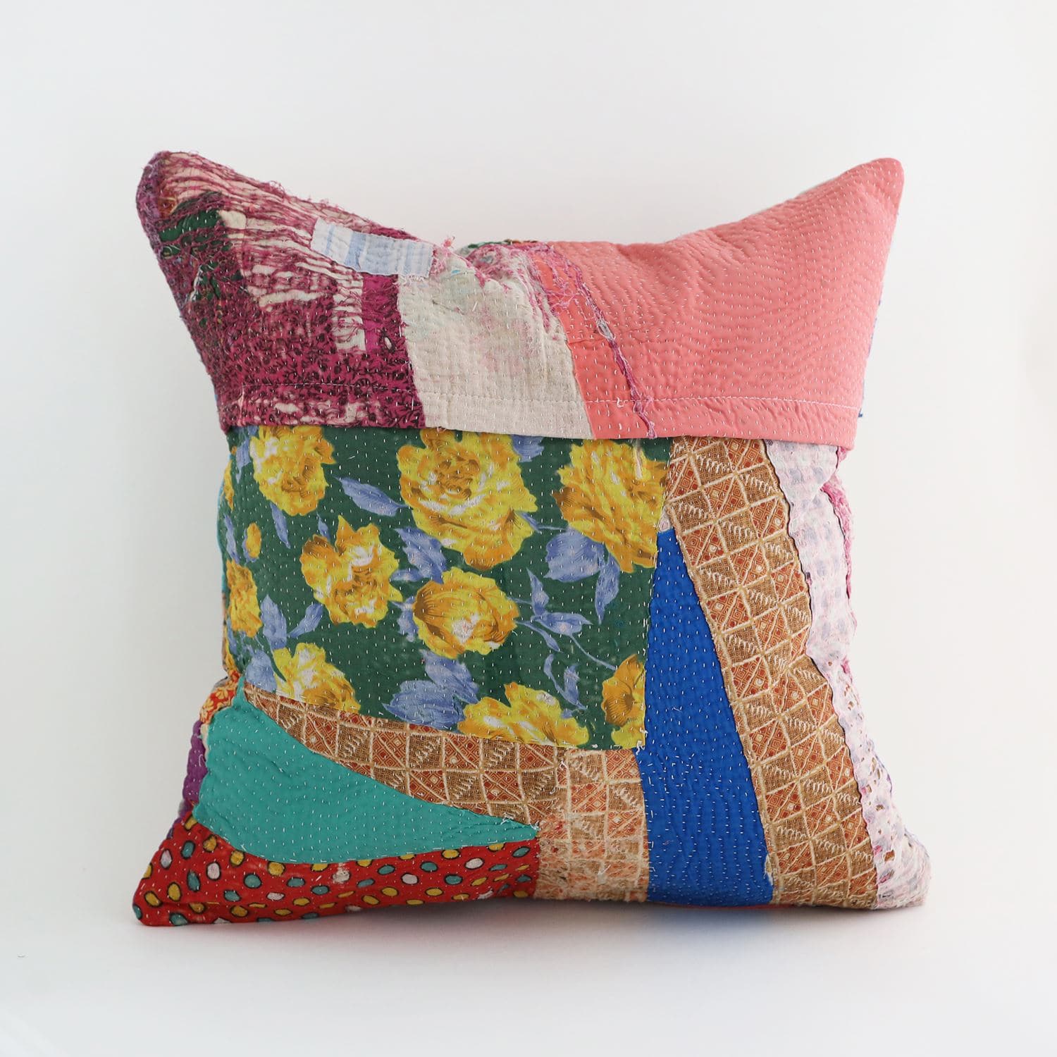 ラリーキルトを使ったクッションカバーです。ラリーキルトは、インド・パキスタンなどの中東アジアで、永い間受け継がれてきた伝統的な布です。古くなったサリーやデュパタ、腰布・古いハギレ等を貼り合わせてパッチワークし、丁寧に刺し子で合わせたもの。インダス河流域の遊牧民の家々では、嫁入り道具として母親から娘へ受け継がれています。気の遠くなるような作業を経て、わが子へ想いをこめて手渡します。一枚一枚に物語があって、何千年にも渡り母から娘へと伝えられる品。布の貼り合わせ方、刺し子の細やかさ、生地の厚みや柄など1つとして同じものはありません。丁寧にハンドメイドで作られているからこその味わいと魅力があります。