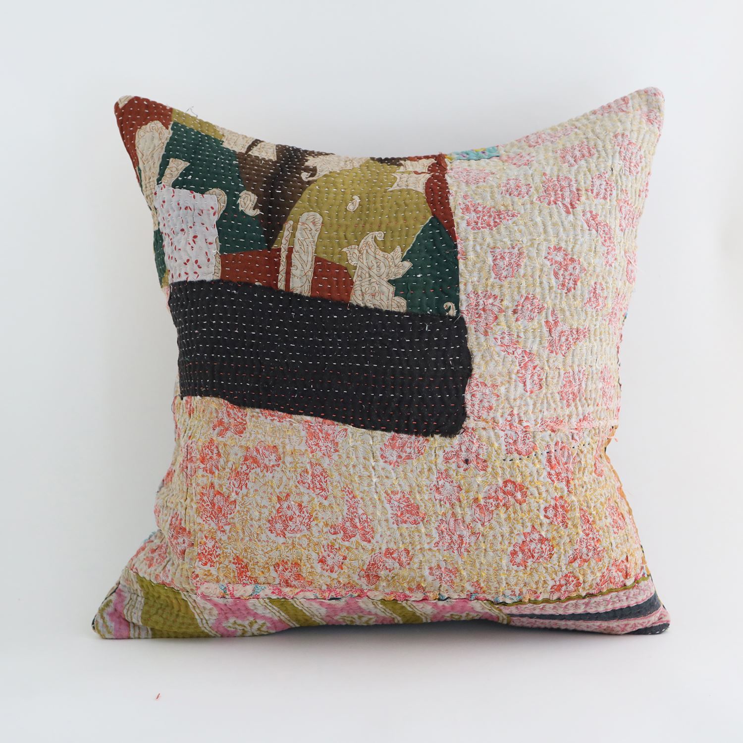 ラリーキルトを使ったクッションカバーです。ラリーキルトは、インド・パキスタンなどの中東アジアで、永い間受け継がれてきた伝統的な布です。古くなったサリーやデュパタ、腰布・古いハギレ等を貼り合わせてパッチワークし、丁寧に刺し子で合わせたもの。インダス河流域の遊牧民の家々では、嫁入り道具として母親から娘へ受け継がれています。気の遠くなるような作業を経て、わが子へ想いをこめて手渡します。一枚一枚に物語があって、何千年にも渡り母から娘へと伝えられる品。布の貼り合わせ方、刺し子の細やかさ、生地の厚みや柄など1つとして同じものはありません。丁寧にハンドメイドで作られているからこその味わいと魅力があります。