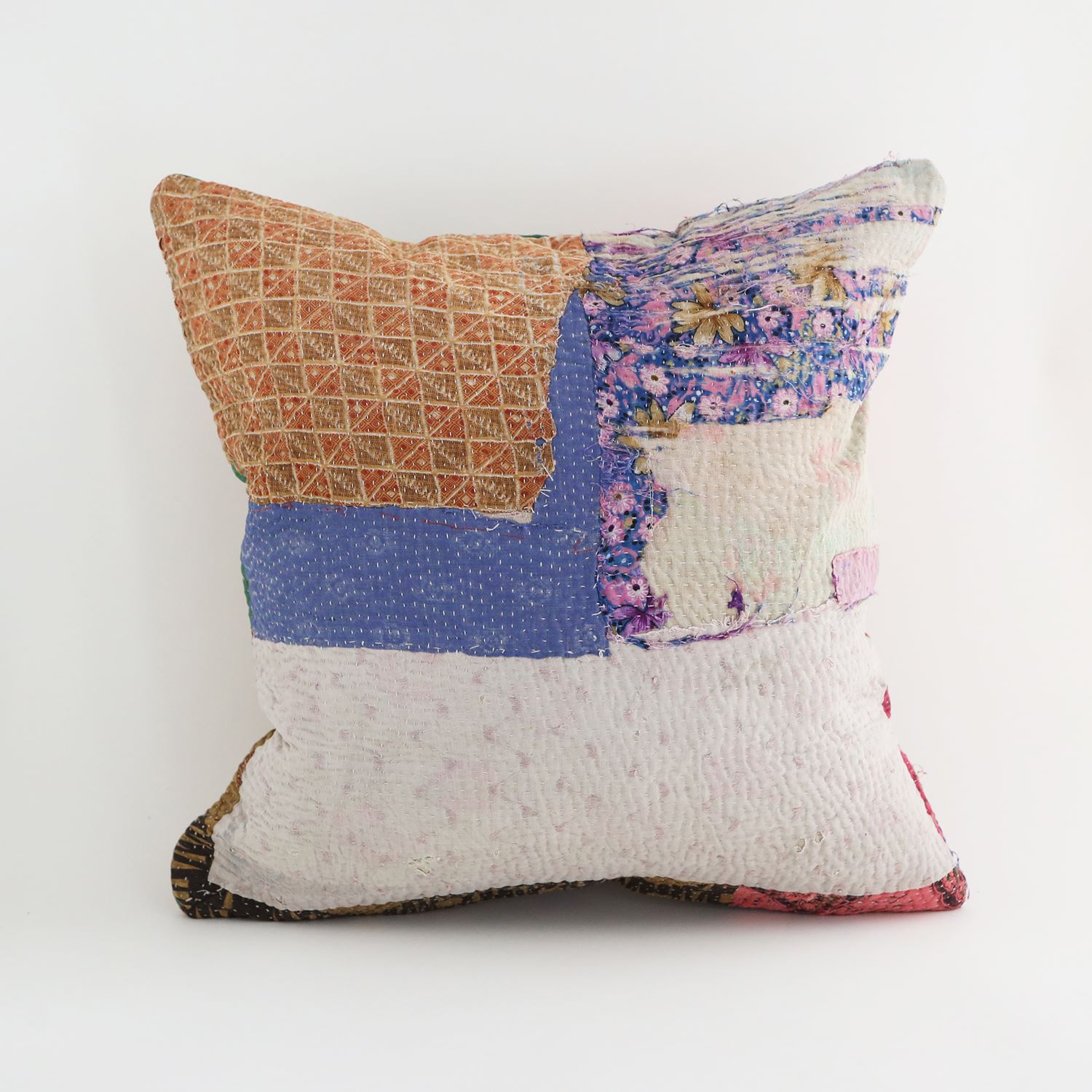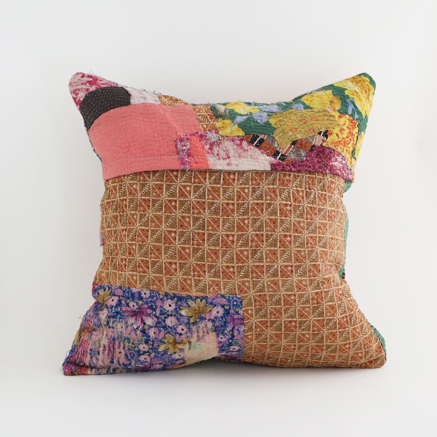 ラリーキルトを使ったクッションカバーです。ラリーキルトは、インド・パキスタンなどの中東アジアで、永い間受け継がれてきた伝統的な布です。古くなったサリーやデュパタ、腰布・古いハギレ等を貼り合わせてパッチワークし、丁寧に刺し子で合わせたもの。インダス河流域の遊牧民の家々では、嫁入り道具として母親から娘へ受け継がれています。気の遠くなるような作業を経て、わが子へ想いをこめて手渡します。一枚一枚に物語があって、何千年にも渡り母から娘へと伝えられる品。布の貼り合わせ方、刺し子の細やかさ、生地の厚みや柄など1つとして同じものはありません。丁寧にハンドメイドで作られているからこその味わいと魅力があります。