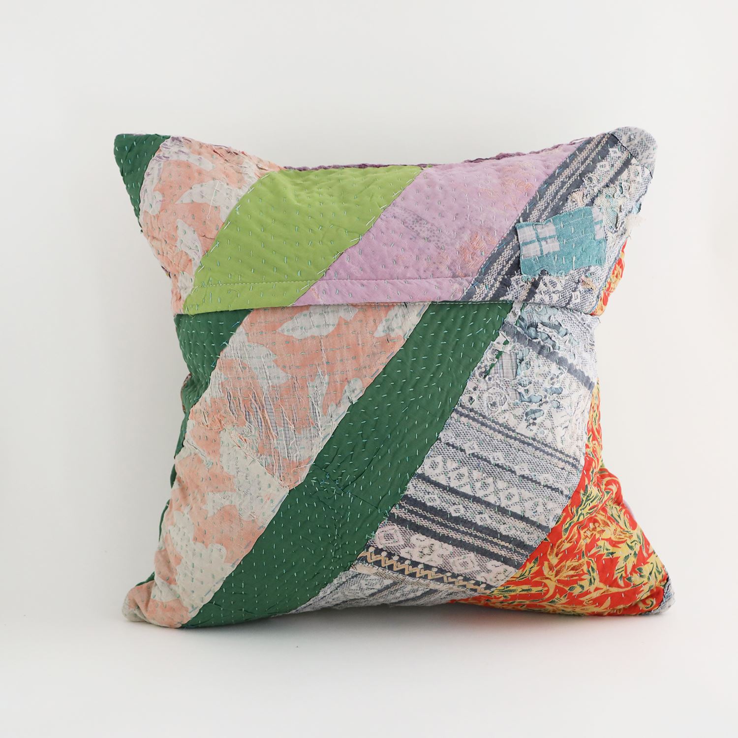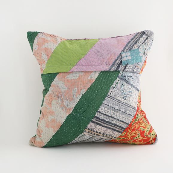 ラリーキルトを使ったクッションカバーです。ラリーキルトは、インド・パキスタンなどの中東アジアで、永い間受け継がれてきた伝統的な布です。古くなったサリーやデュパタ、腰布・古いハギレ等を貼り合わせてパッチワークし、丁寧に刺し子で合わせたもの。インダス河流域の遊牧民の家々では、嫁入り道具として母親から娘へ受け継がれています。気の遠くなるような作業を経て、わが子へ想いをこめて手渡します。一枚一枚に物語があって、何千年にも渡り母から娘へと伝えられる品。布の貼り合わせ方、刺し子の細やかさ、生地の厚みや柄など1つとして同じものはありません。丁寧にハンドメイドで作られているからこその味わいと魅力があります。