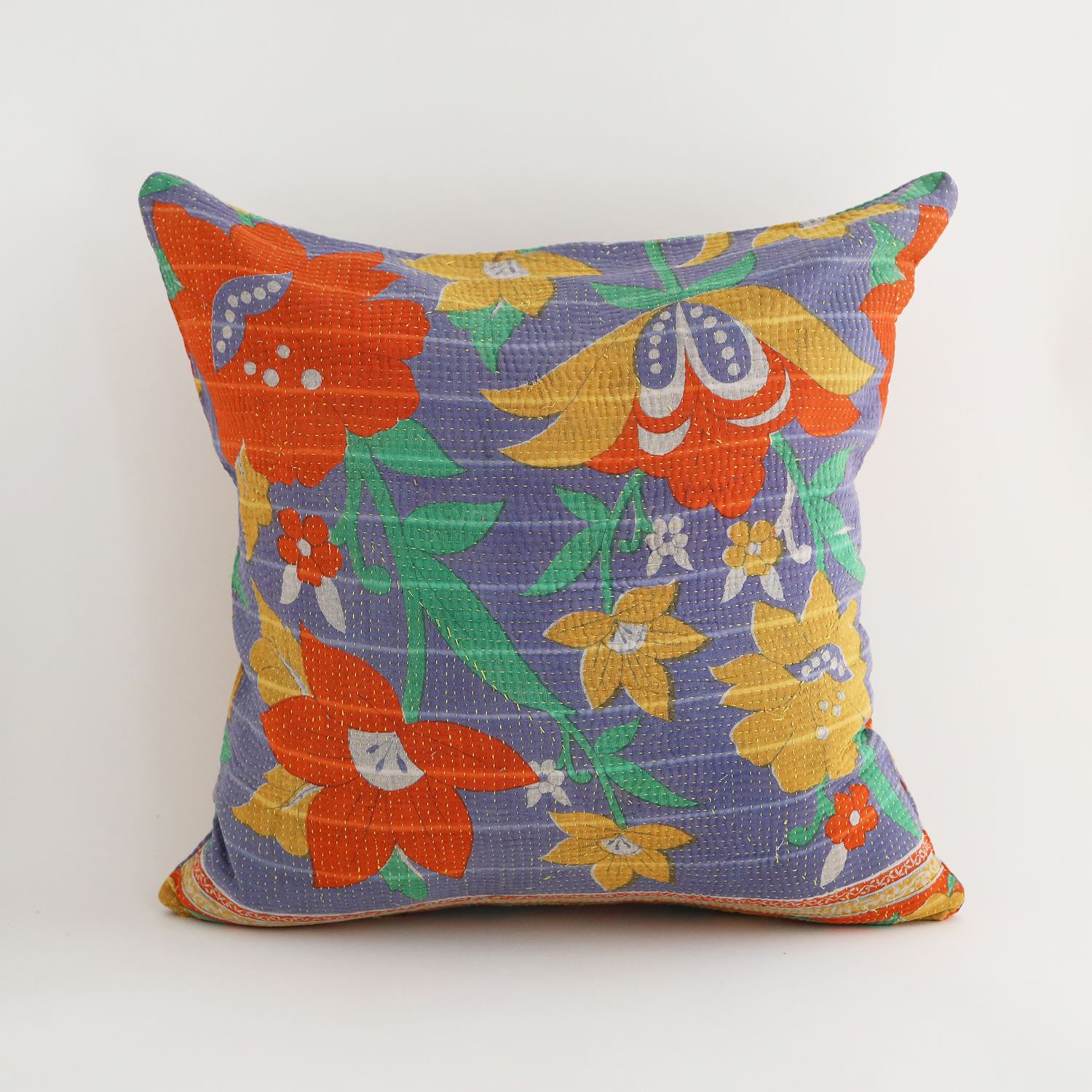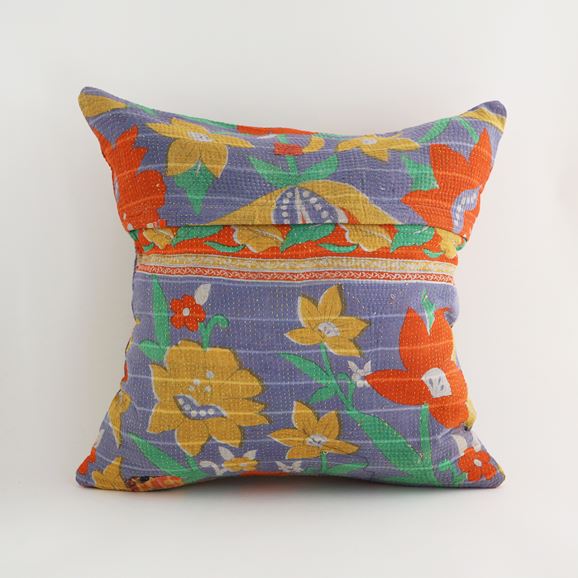 ラリーキルトを使ったクッションカバーです。ラリーキルトは、インド・パキスタンなどの中東アジアで、永い間受け継がれてきた伝統的な布です。古くなったサリーやデュパタ、腰布・古いハギレ等を貼り合わせてパッチワークし、丁寧に刺し子で合わせたもの。インダス河流域の遊牧民の家々では、嫁入り道具として母親から娘へ受け継がれています。気の遠くなるような作業を経て、わが子へ想いをこめて手渡します。一枚一枚に物語があって、何千年にも渡り母から娘へと伝えられる品。布の貼り合わせ方、刺し子の細やかさ、生地の厚みや柄など1つとして同じものはありません。丁寧にハンドメイドで作られているからこその味わいと魅力があります。