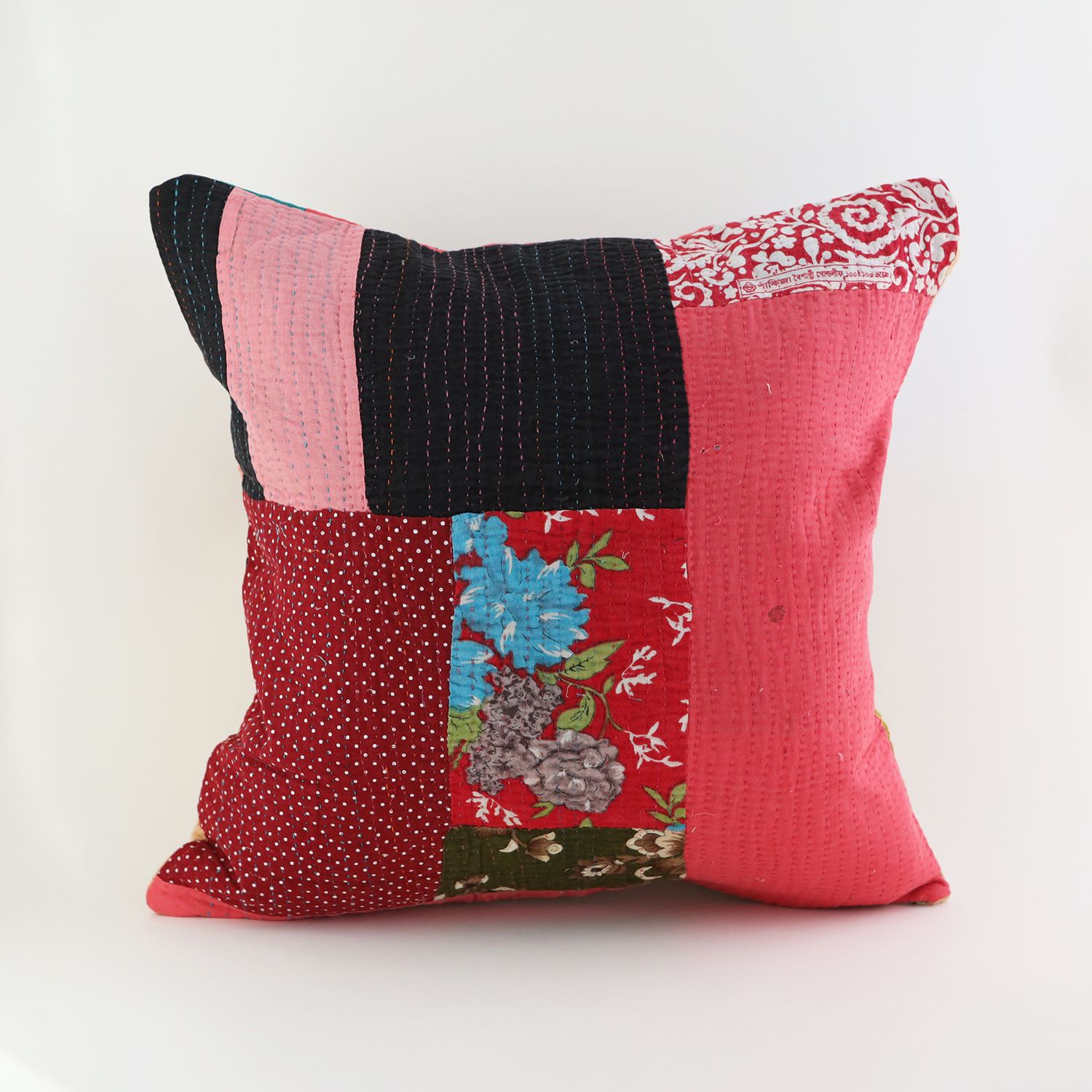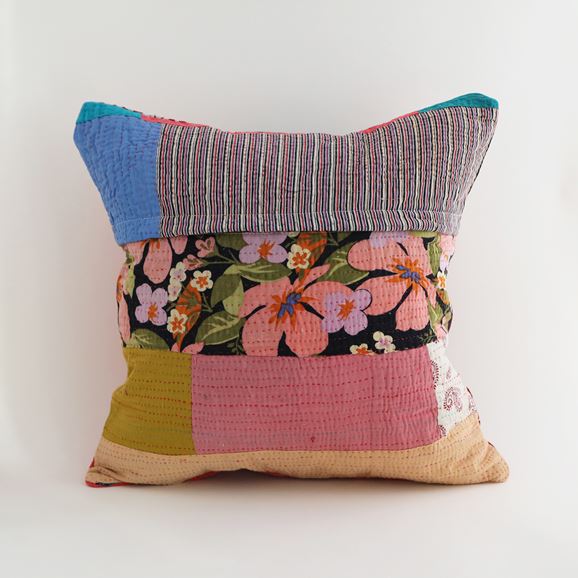 ラリーキルトを使ったクッションカバーです。ラリーキルトは、インド・パキスタンなどの中東アジアで、永い間受け継がれてきた伝統的な布です。古くなったサリーやデュパタ、腰布・古いハギレ等を貼り合わせてパッチワークし、丁寧に刺し子で合わせたもの。インダス河流域の遊牧民の家々では、嫁入り道具として母親から娘へ受け継がれています。気の遠くなるような作業を経て、わが子へ想いをこめて手渡します。一枚一枚に物語があって、何千年にも渡り母から娘へと伝えられる品。布の貼り合わせ方、刺し子の細やかさ、生地の厚みや柄など1つとして同じものはありません。丁寧にハンドメイドで作られているからこその味わいと魅力があります。