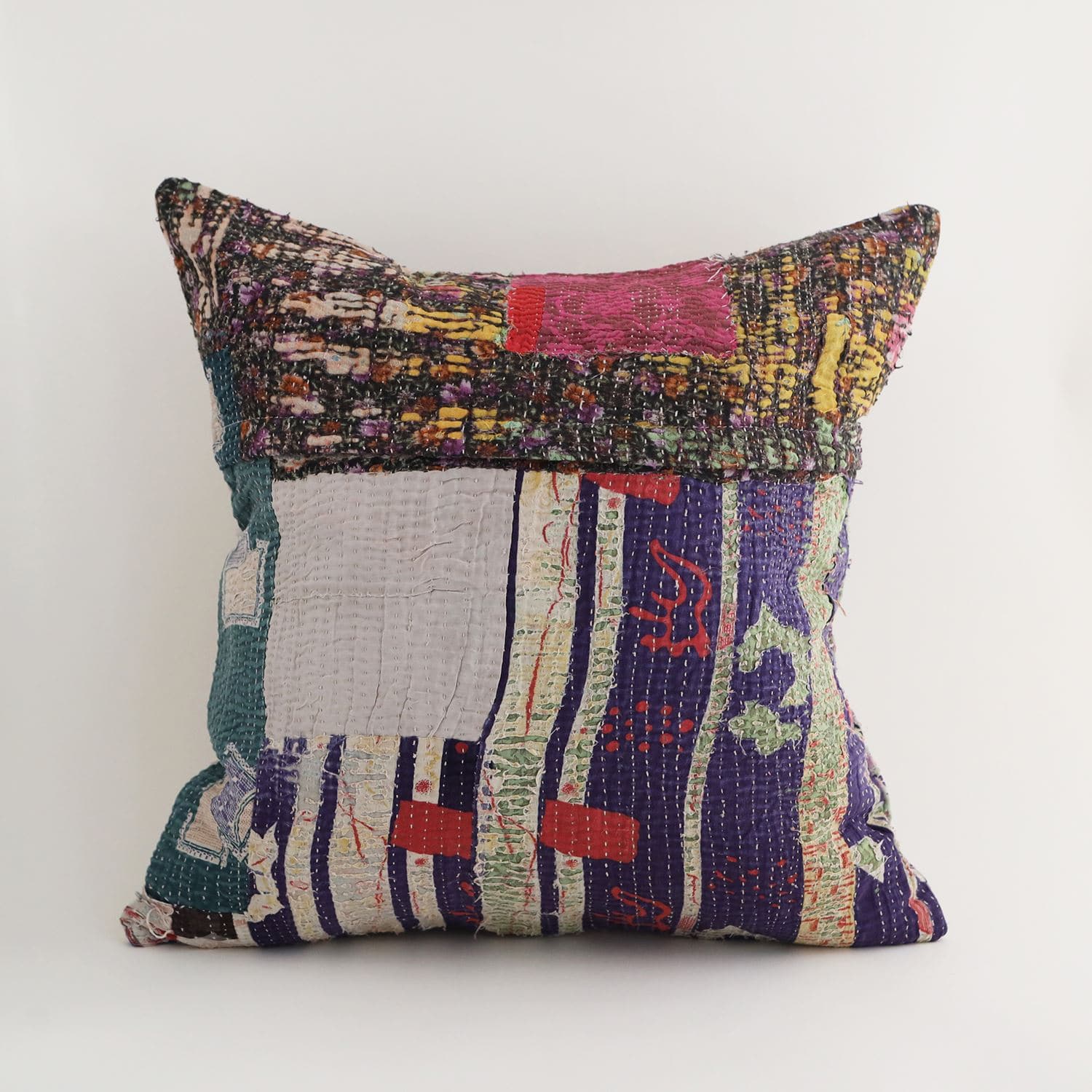 ラリーキルトを使ったクッションカバーです。ラリーキルトは、インド・パキスタンなどの中東アジアで、永い間受け継がれてきた伝統的な布です。古くなったサリーやデュパタ、腰布・古いハギレ等を貼り合わせてパッチワークし、丁寧に刺し子で合わせたもの。インダス河流域の遊牧民の家々では、嫁入り道具として母親から娘へ受け継がれています。気の遠くなるような作業を経て、わが子へ想いをこめて手渡します。一枚一枚に物語があって、何千年にも渡り母から娘へと伝えられる品。布の貼り合わせ方、刺し子の細やかさ、生地の厚みや柄など1つとして同じものはありません。丁寧にハンドメイドで作られているからこその味わいと魅力があります。