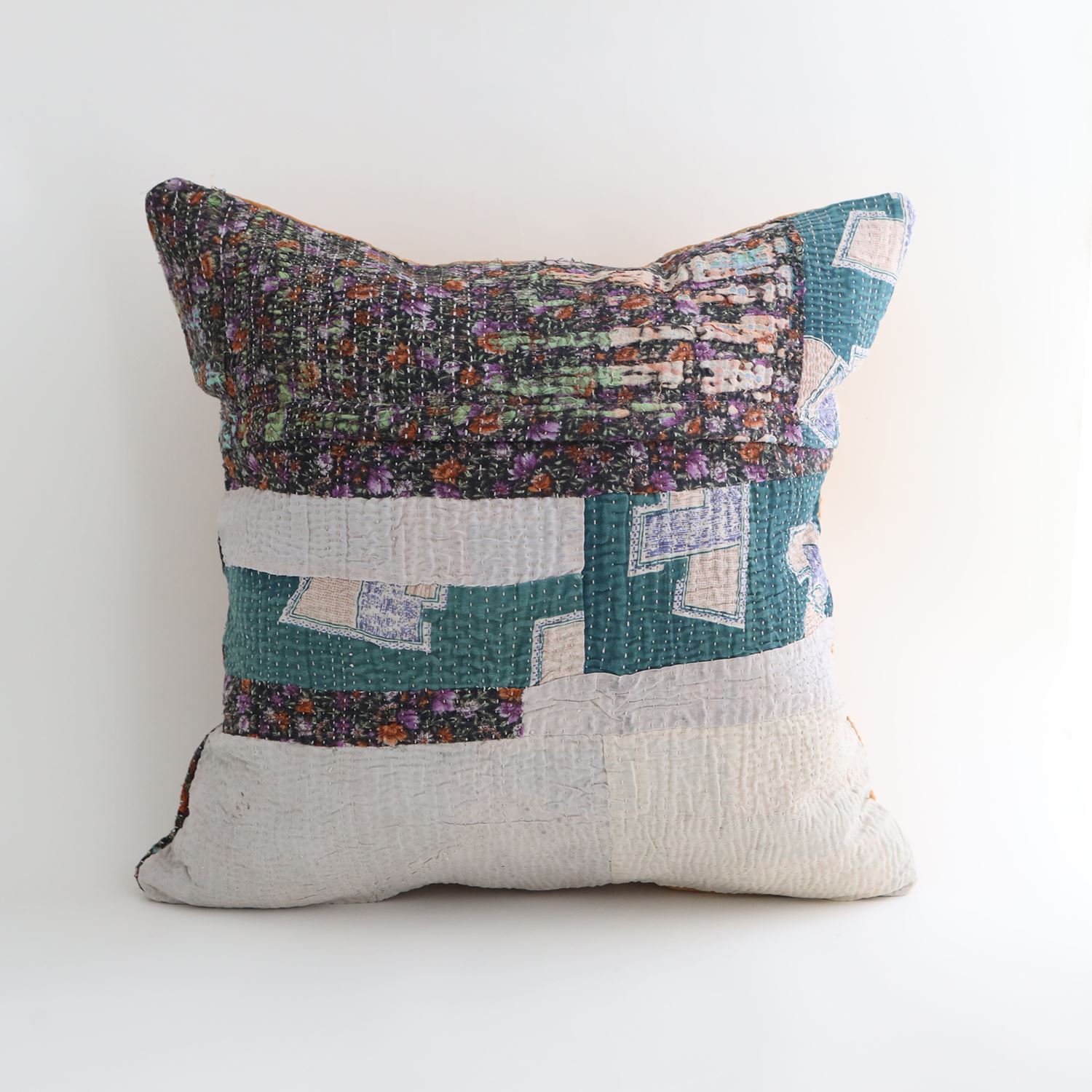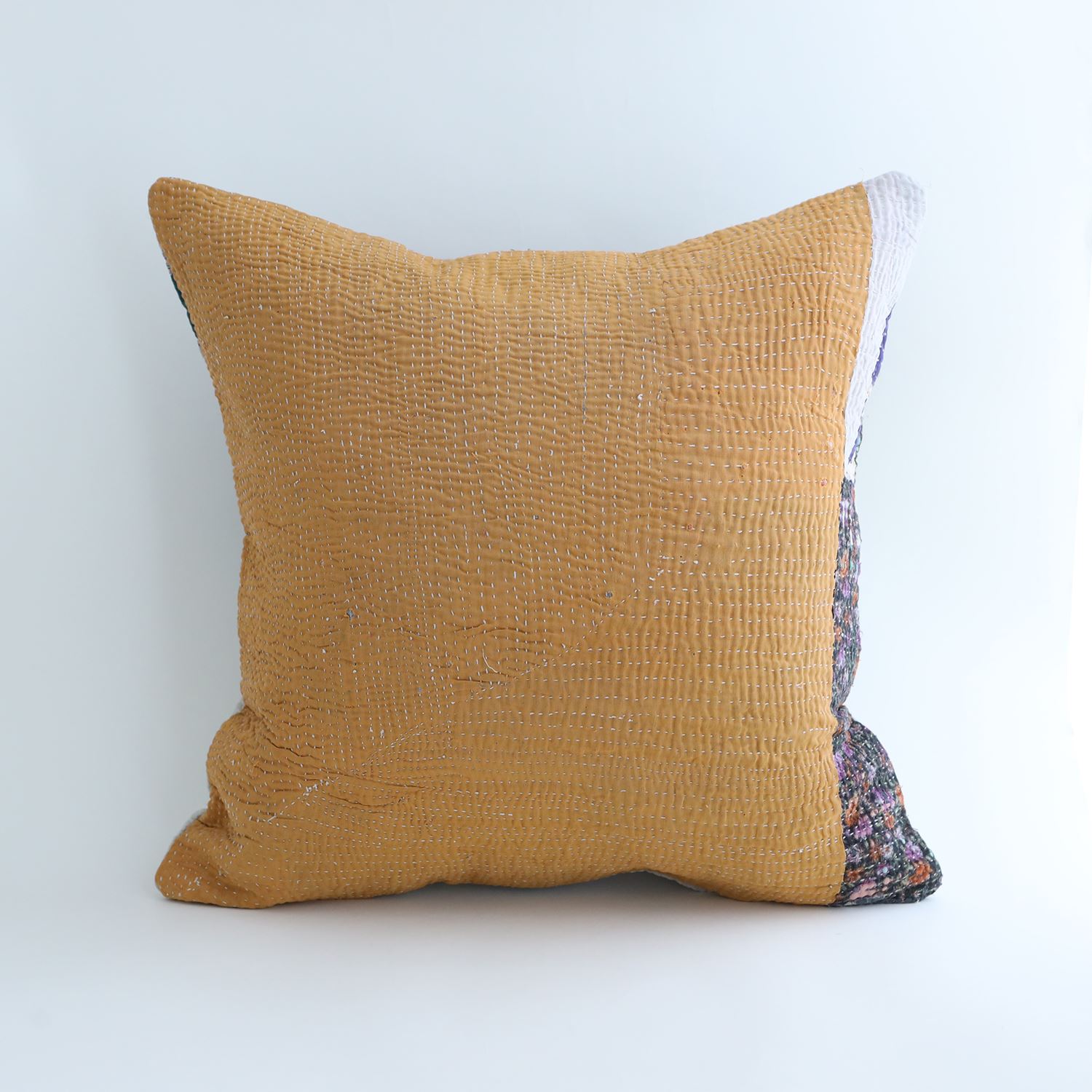 ラリーキルトを使ったクッションカバーです。ラリーキルトは、インド・パキスタンなどの中東アジアで、永い間受け継がれてきた伝統的な布です。古くなったサリーやデュパタ、腰布・古いハギレ等を貼り合わせてパッチワークし、丁寧に刺し子で合わせたもの。インダス河流域の遊牧民の家々では、嫁入り道具として母親から娘へ受け継がれています。気の遠くなるような作業を経て、わが子へ想いをこめて手渡します。一枚一枚に物語があって、何千年にも渡り母から娘へと伝えられる品。布の貼り合わせ方、刺し子の細やかさ、生地の厚みや柄など1つとして同じものはありません。丁寧にハンドメイドで作られているからこその味わいと魅力があります。