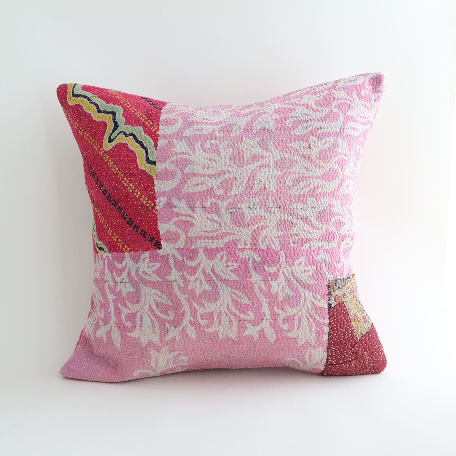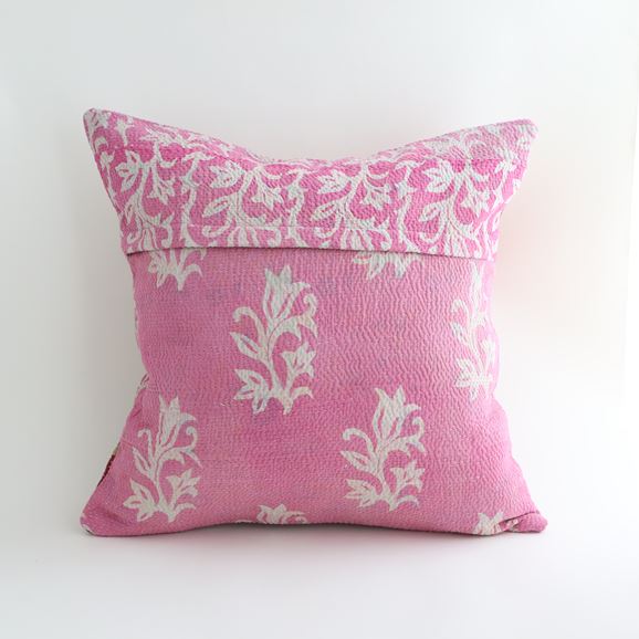 ラリーキルトを使ったクッションカバーです。ラリーキルトは、インド・パキスタンなどの中東アジアで、永い間受け継がれてきた伝統的な布です。古くなったサリーやデュパタ、腰布・古いハギレ等を貼り合わせてパッチワークし、丁寧に刺し子で合わせたもの。インダス河流域の遊牧民の家々では、嫁入り道具として母親から娘へ受け継がれています。気の遠くなるような作業を経て、わが子へ想いをこめて手渡します。一枚一枚に物語があって、何千年にも渡り母から娘へと伝えられる品。布の貼り合わせ方、刺し子の細やかさ、生地の厚みや柄など1つとして同じものはありません。丁寧にハンドメイドで作られているからこその味わいと魅力があります。