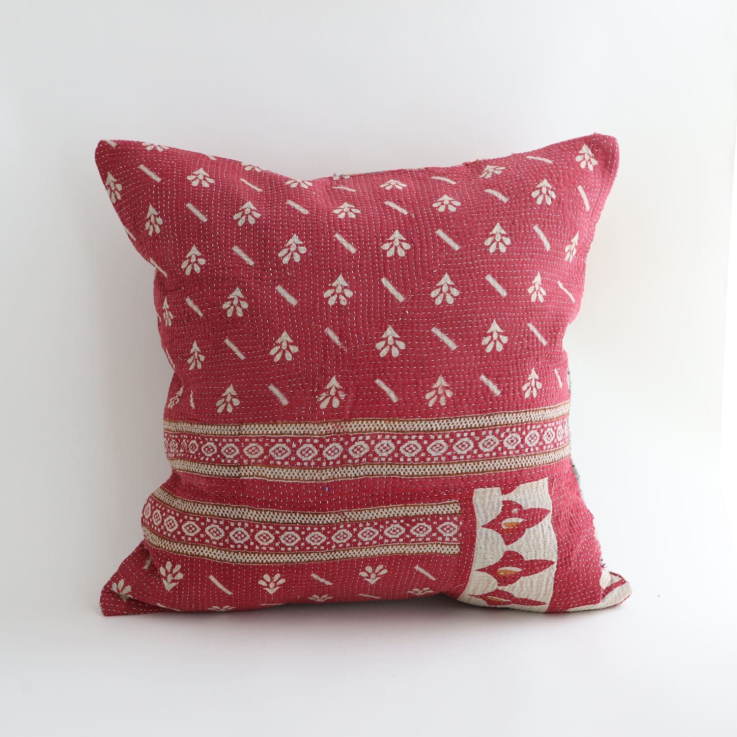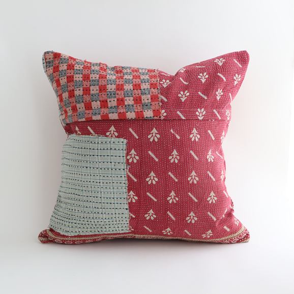 ラリーキルトを使ったクッションカバーです。ラリーキルトは、インド・パキスタンなどの中東アジアで、永い間受け継がれてきた伝統的な布です。古くなったサリーやデュパタ、腰布・古いハギレ等を貼り合わせてパッチワークし、丁寧に刺し子で合わせたもの。インダス河流域の遊牧民の家々では、嫁入り道具として母親から娘へ受け継がれています。気の遠くなるような作業を経て、わが子へ想いをこめて手渡します。一枚一枚に物語があって、何千年にも渡り母から娘へと伝えられる品。布の貼り合わせ方、刺し子の細やかさ、生地の厚みや柄など1つとして同じものはありません。丁寧にハンドメイドで作られているからこその味わいと魅力があります。