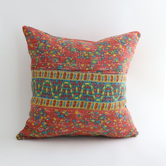 ラリーキルトを使ったクッションカバーです。ラリーキルトは、インド・パキスタンなどの中東アジアで、永い間受け継がれてきた伝統的な布です。古くなったサリーやデュパタ、腰布・古いハギレ等を貼り合わせてパッチワークし、丁寧に刺し子で合わせたもの。インダス河流域の遊牧民の家々では、嫁入り道具として母親から娘へ受け継がれています。気の遠くなるような作業を経て、わが子へ想いをこめて手渡します。一枚一枚に物語があって、何千年にも渡り母から娘へと伝えられる品。布の貼り合わせ方、刺し子の細やかさ、生地の厚みや柄など1つとして同じものはありません。丁寧にハンドメイドで作られているからこその味わいと魅力があります。