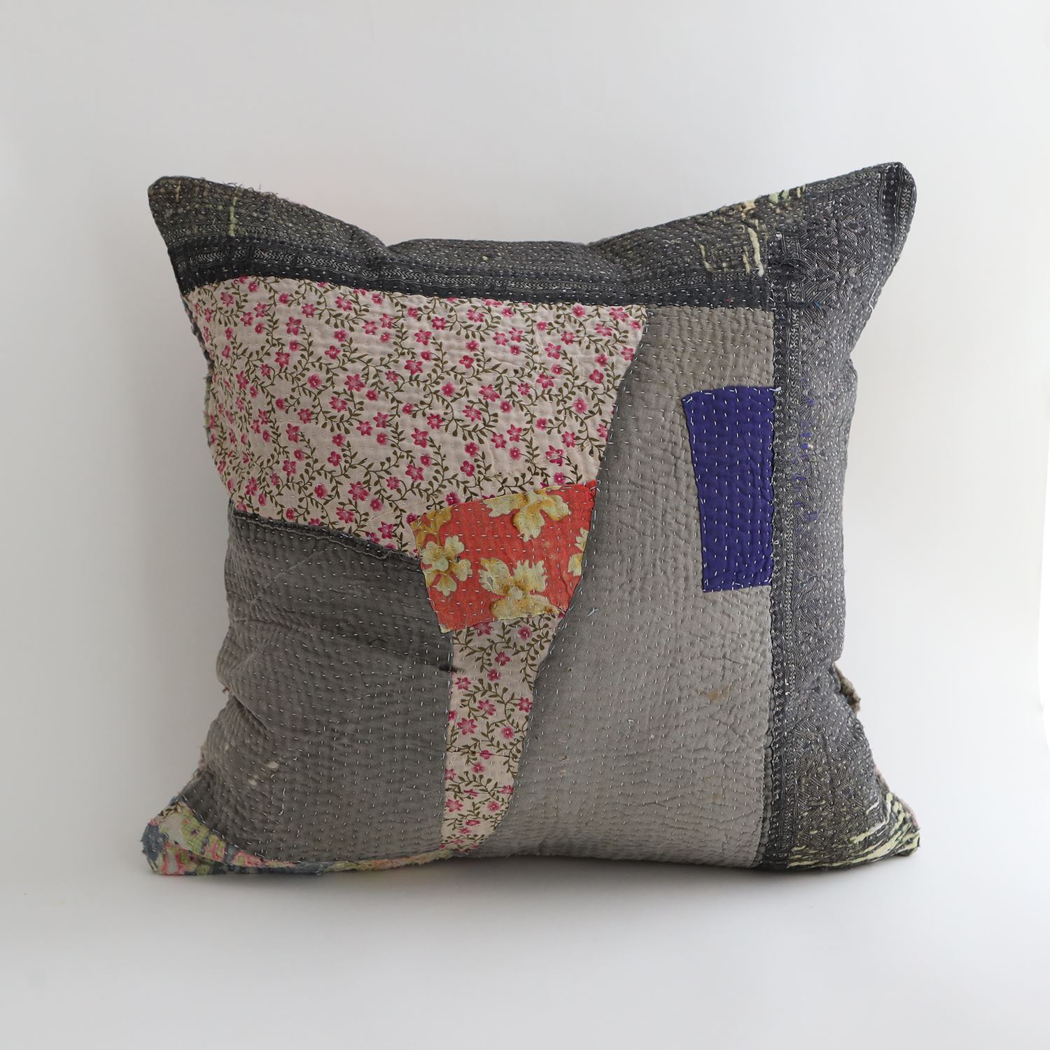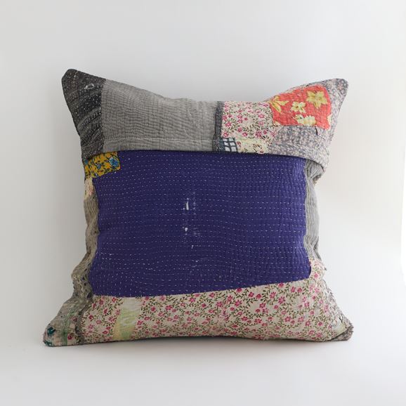 ラリーキルトを使ったクッションカバーです。ラリーキルトは、インド・パキスタンなどの中東アジアで、永い間受け継がれてきた伝統的な布です。古くなったサリーやデュパタ、腰布・古いハギレ等を貼り合わせてパッチワークし、丁寧に刺し子で合わせたもの。インダス河流域の遊牧民の家々では、嫁入り道具として母親から娘へ受け継がれています。気の遠くなるような作業を経て、わが子へ想いをこめて手渡します。一枚一枚に物語があって、何千年にも渡り母から娘へと伝えられる品。布の貼り合わせ方、刺し子の細やかさ、生地の厚みや柄など1つとして同じものはありません。丁寧にハンドメイドで作られているからこその味わいと魅力があります。