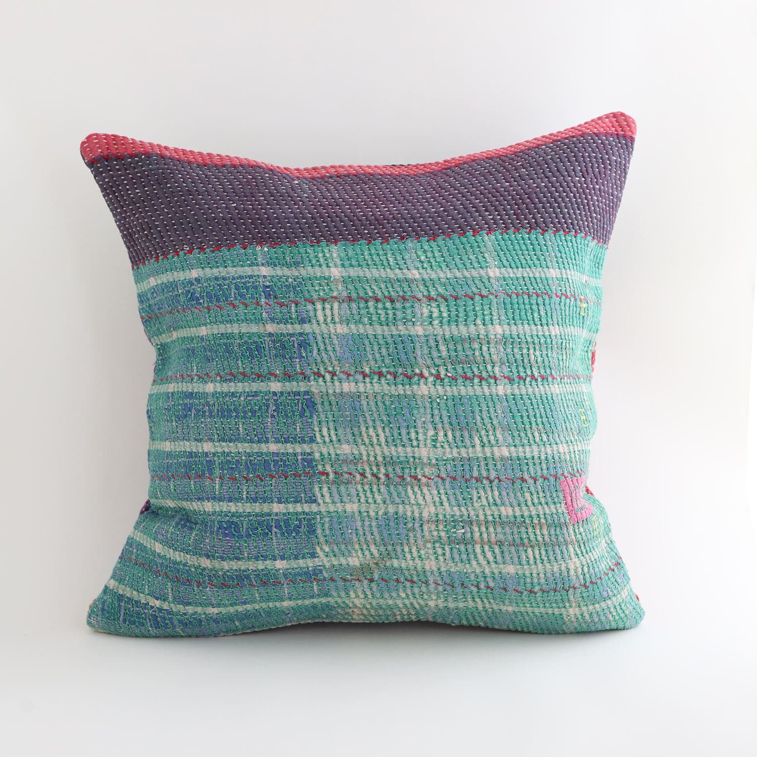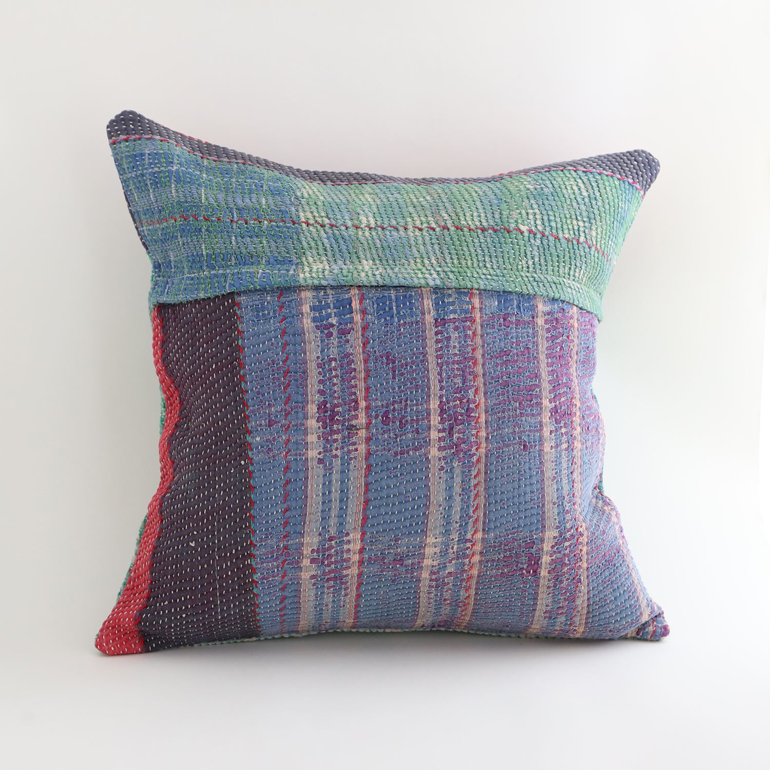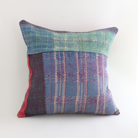 ラリーキルトを使ったクッションカバーです。ラリーキルトは、インド・パキスタンなどの中東アジアで、永い間受け継がれてきた伝統的な布です。古くなったサリーやデュパタ、腰布・古いハギレ等を貼り合わせてパッチワークし、丁寧に刺し子で合わせたもの。インダス河流域の遊牧民の家々では、嫁入り道具として母親から娘へ受け継がれています。気の遠くなるような作業を経て、わが子へ想いをこめて手渡します。一枚一枚に物語があって、何千年にも渡り母から娘へと伝えられる品。布の貼り合わせ方、刺し子の細やかさ、生地の厚みや柄など1つとして同じものはありません。丁寧にハンドメイドで作られているからこその味わいと魅力があります。