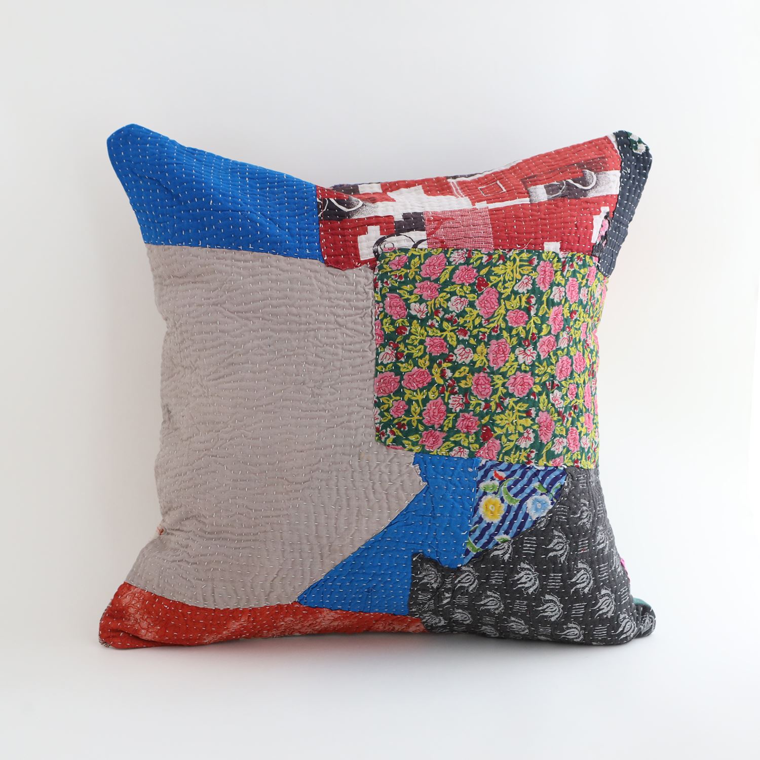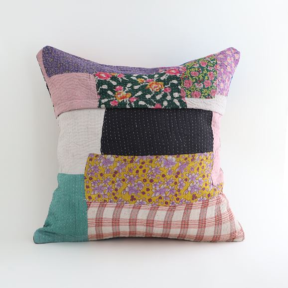 ラリーキルトを使ったクッションカバーです。ラリーキルトは、インド・パキスタンなどの中東アジアで、永い間受け継がれてきた伝統的な布です。古くなったサリーやデュパタ、腰布・古いハギレ等を貼り合わせてパッチワークし、丁寧に刺し子で合わせたもの。インダス河流域の遊牧民の家々では、嫁入り道具として母親から娘へ受け継がれています。気の遠くなるような作業を経て、わが子へ想いをこめて手渡します。一枚一枚に物語があって、何千年にも渡り母から娘へと伝えられる品。布の貼り合わせ方、刺し子の細やかさ、生地の厚みや柄など1つとして同じものはありません。丁寧にハンドメイドで作られているからこその味わいと魅力があります。