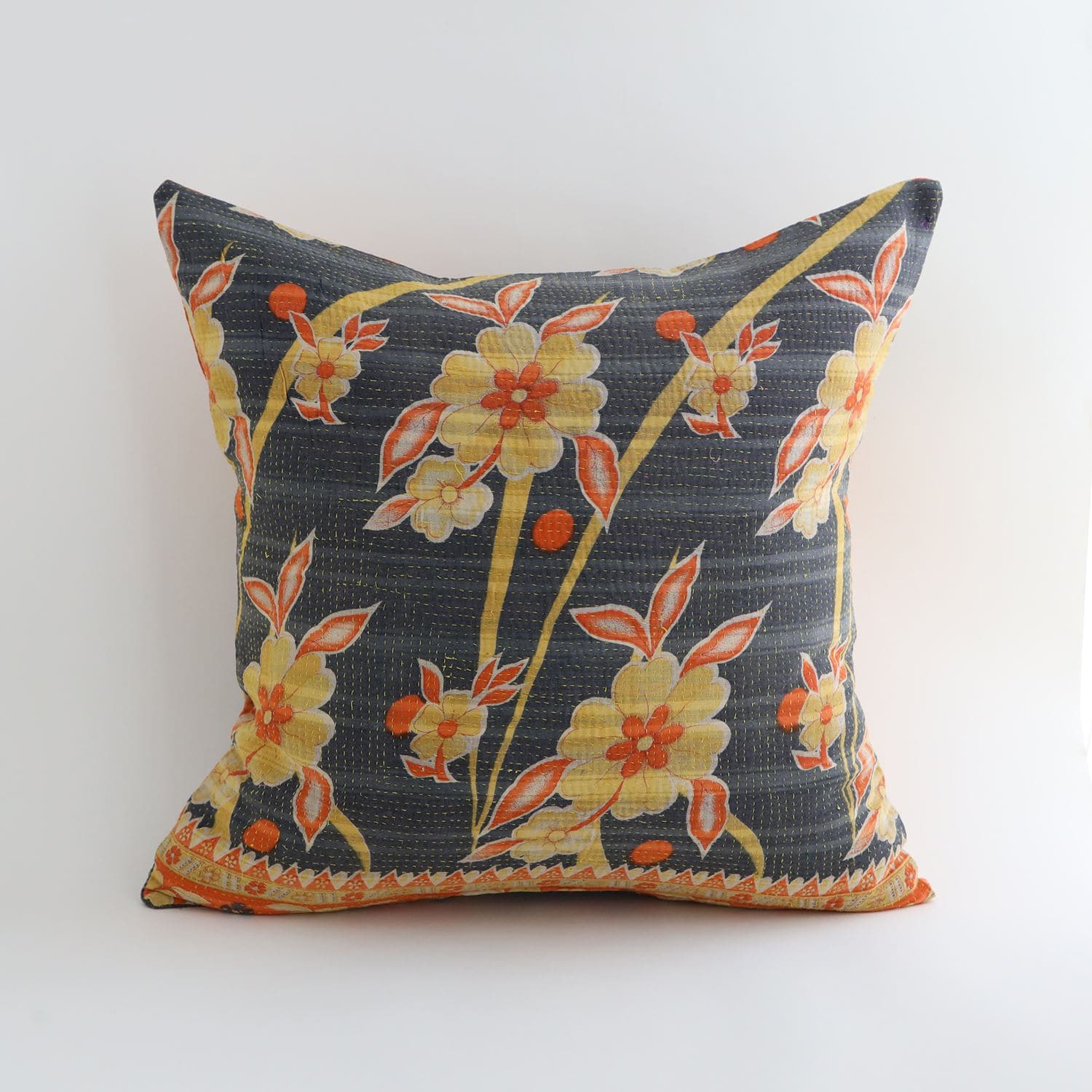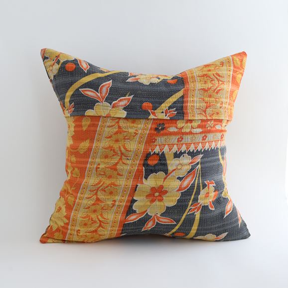 ラリーキルトを使ったクッションカバーです。ラリーキルトは、インド・パキスタンなどの中東アジアで、永い間受け継がれてきた伝統的な布です。古くなったサリーやデュパタ、腰布・古いハギレ等を貼り合わせてパッチワークし、丁寧に刺し子で合わせたもの。インダス河流域の遊牧民の家々では、嫁入り道具として母親から娘へ受け継がれています。気の遠くなるような作業を経て、わが子へ想いをこめて手渡します。一枚一枚に物語があって、何千年にも渡り母から娘へと伝えられる品。布の貼り合わせ方、刺し子の細やかさ、生地の厚みや柄など1つとして同じものはありません。丁寧にハンドメイドで作られているからこその味わいと魅力があります。