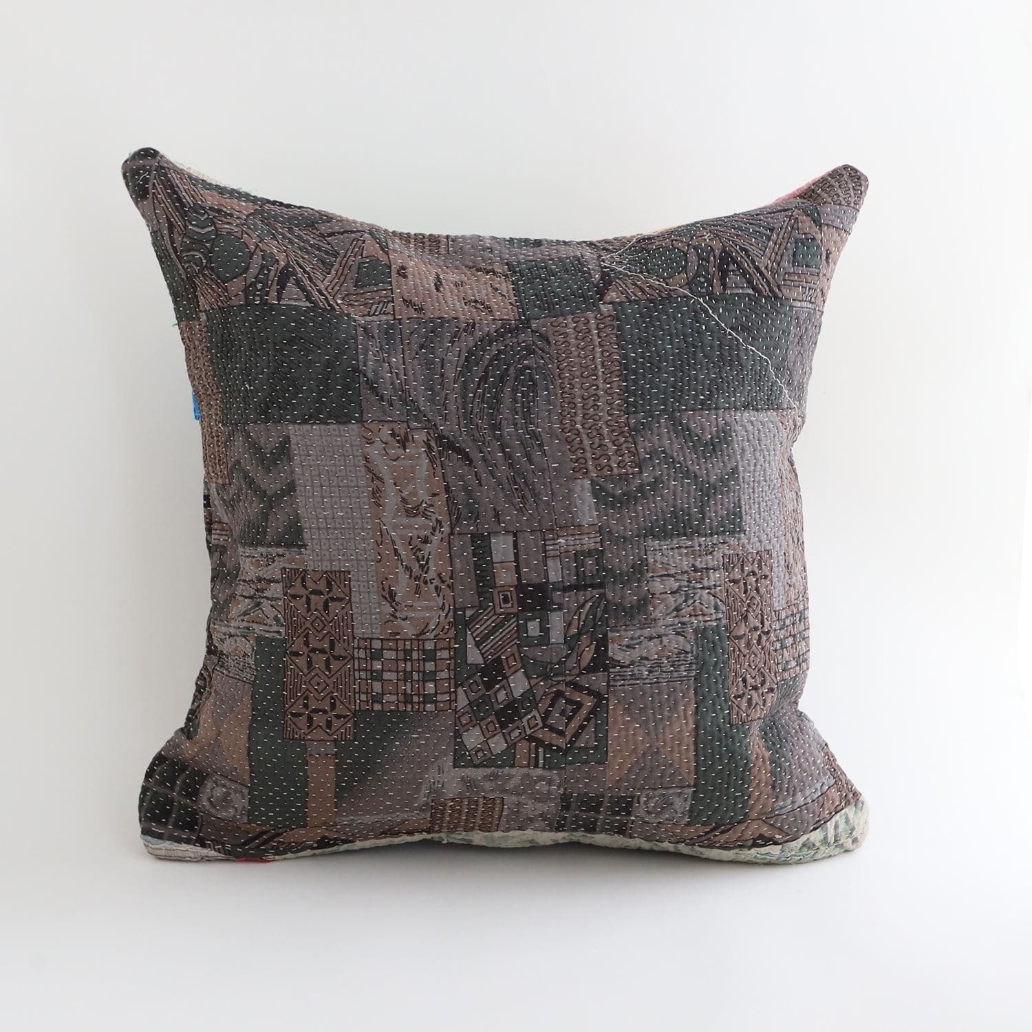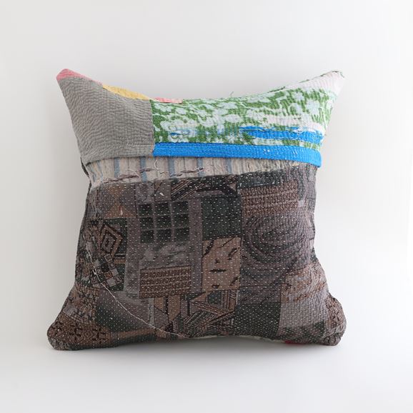 ラリーキルトを使ったクッションカバーです。ラリーキルトは、インド・パキスタンなどの中東アジアで、永い間受け継がれてきた伝統的な布です。古くなったサリーやデュパタ、腰布・古いハギレ等を貼り合わせてパッチワークし、丁寧に刺し子で合わせたもの。インダス河流域の遊牧民の家々では、嫁入り道具として母親から娘へ受け継がれています。気の遠くなるような作業を経て、わが子へ想いをこめて手渡します。一枚一枚に物語があって、何千年にも渡り母から娘へと伝えられる品。布の貼り合わせ方、刺し子の細やかさ、生地の厚みや柄など1つとして同じものはありません。丁寧にハンドメイドで作られているからこその味わいと魅力があります。