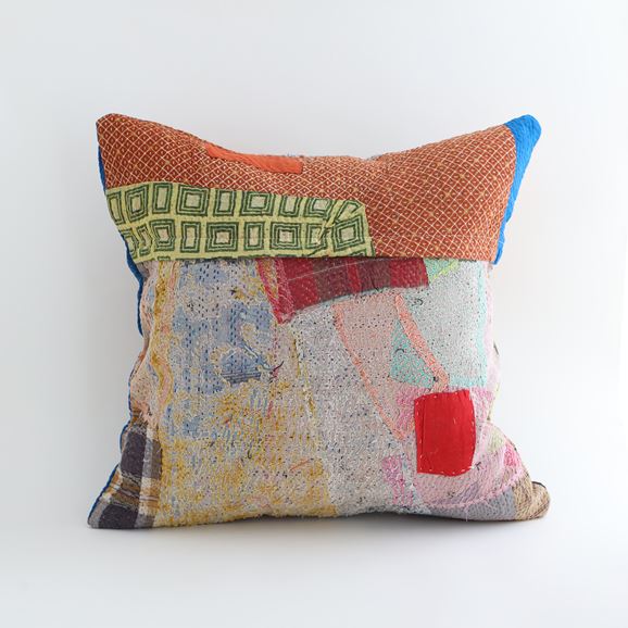 ラリーキルトを使ったクッションカバーです。ラリーキルトは、インド・パキスタンなどの中東アジアで、永い間受け継がれてきた伝統的な布です。古くなったサリーやデュパタ、腰布・古いハギレ等を貼り合わせてパッチワークし、丁寧に刺し子で合わせたもの。インダス河流域の遊牧民の家々では、嫁入り道具として母親から娘へ受け継がれています。気の遠くなるような作業を経て、わが子へ想いをこめて手渡します。一枚一枚に物語があって、何千年にも渡り母から娘へと伝えられる品。布の貼り合わせ方、刺し子の細やかさ、生地の厚みや柄など1つとして同じものはありません。丁寧にハンドメイドで作られているからこその味わいと魅力があります。