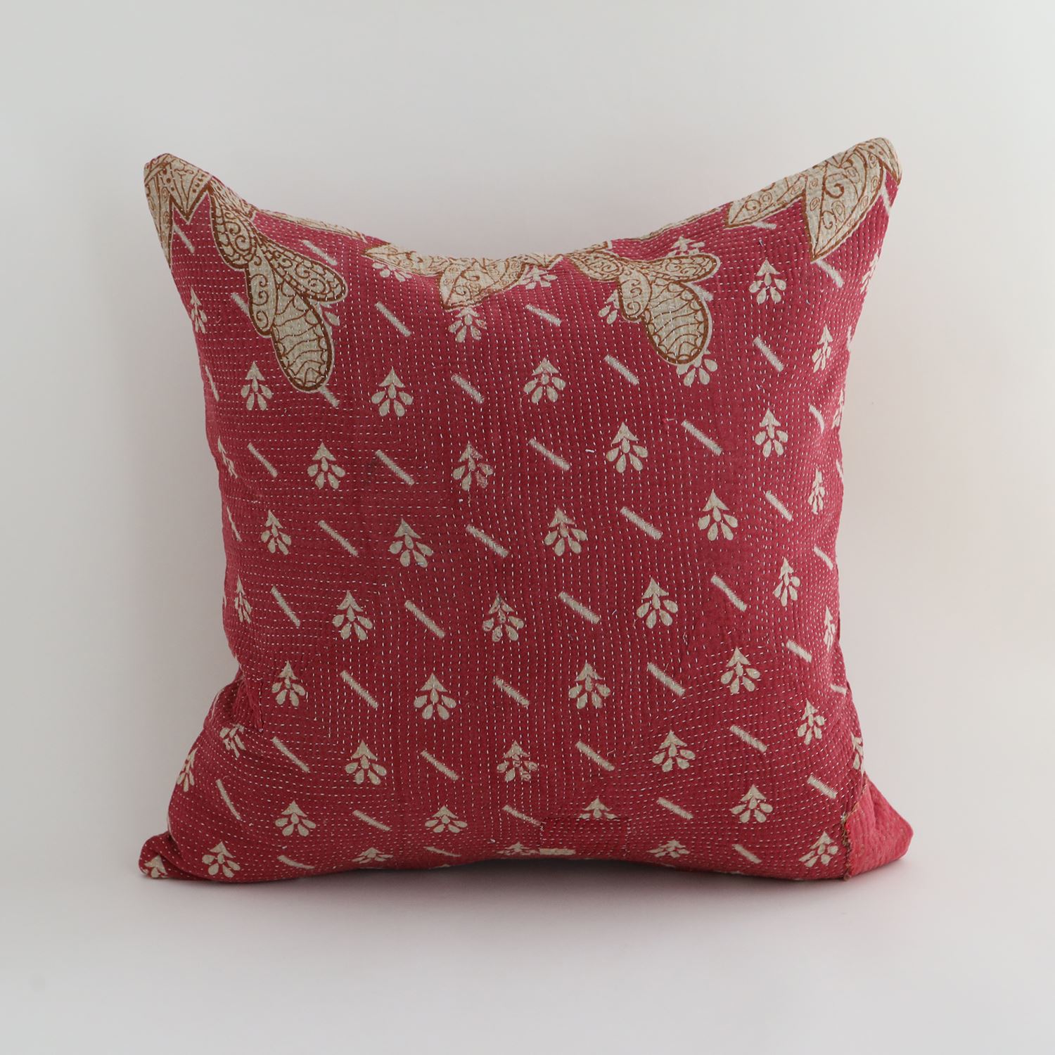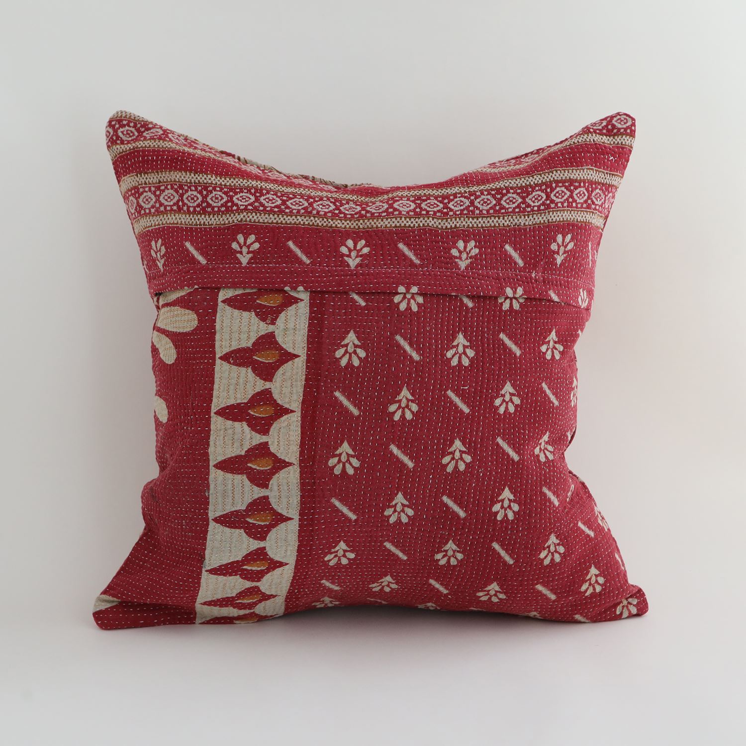 ラリーキルトを使ったクッションカバーです。ラリーキルトは、インド・パキスタンなどの中東アジアで、永い間受け継がれてきた伝統的な布です。古くなったサリーやデュパタ、腰布・古いハギレ等を貼り合わせてパッチワークし、丁寧に刺し子で合わせたもの。インダス河流域の遊牧民の家々では、嫁入り道具として母親から娘へ受け継がれています。気の遠くなるような作業を経て、わが子へ想いをこめて手渡します。一枚一枚に物語があって、何千年にも渡り母から娘へと伝えられる品。布の貼り合わせ方、刺し子の細やかさ、生地の厚みや柄など1つとして同じものはありません。丁寧にハンドメイドで作られているからこその味わいと魅力があります。