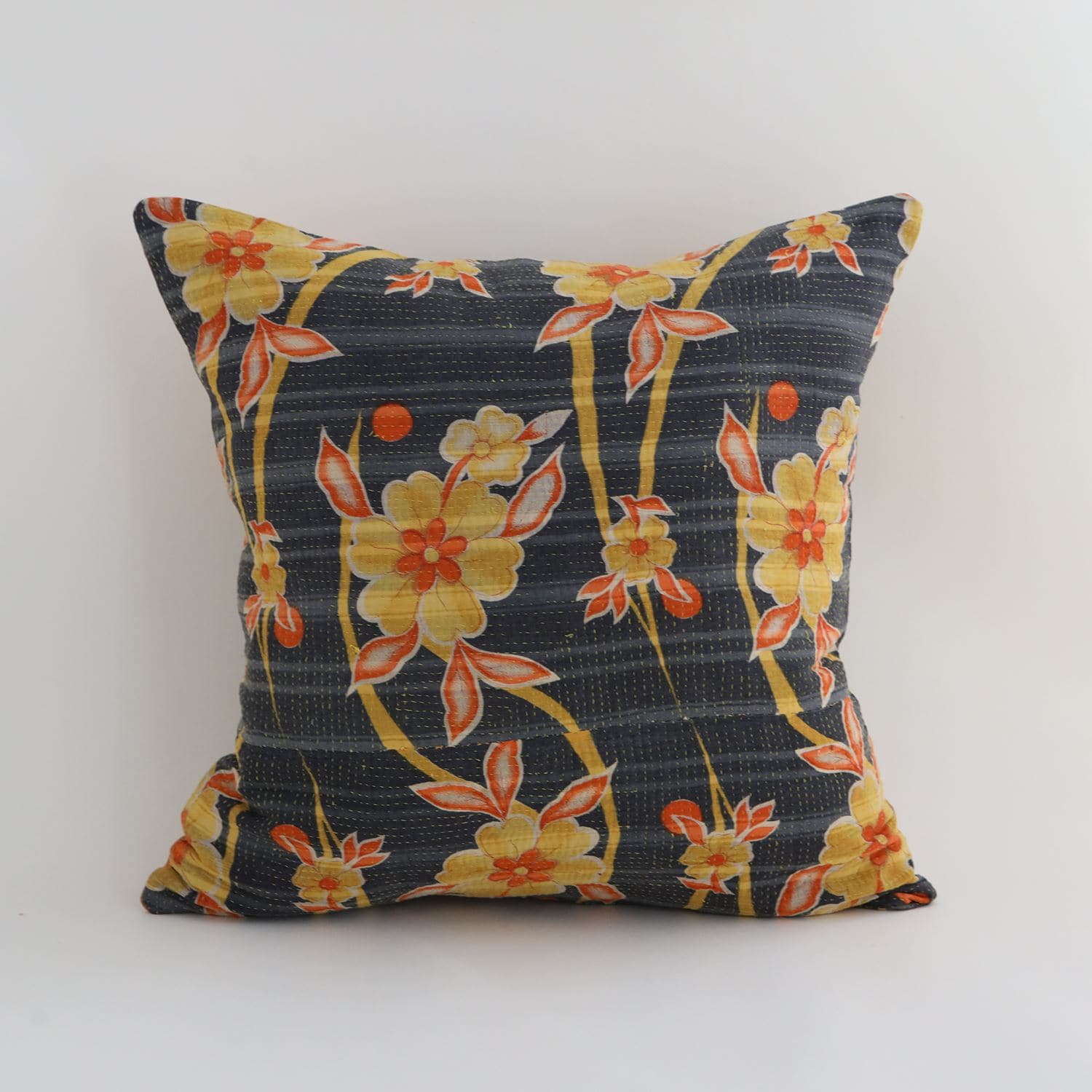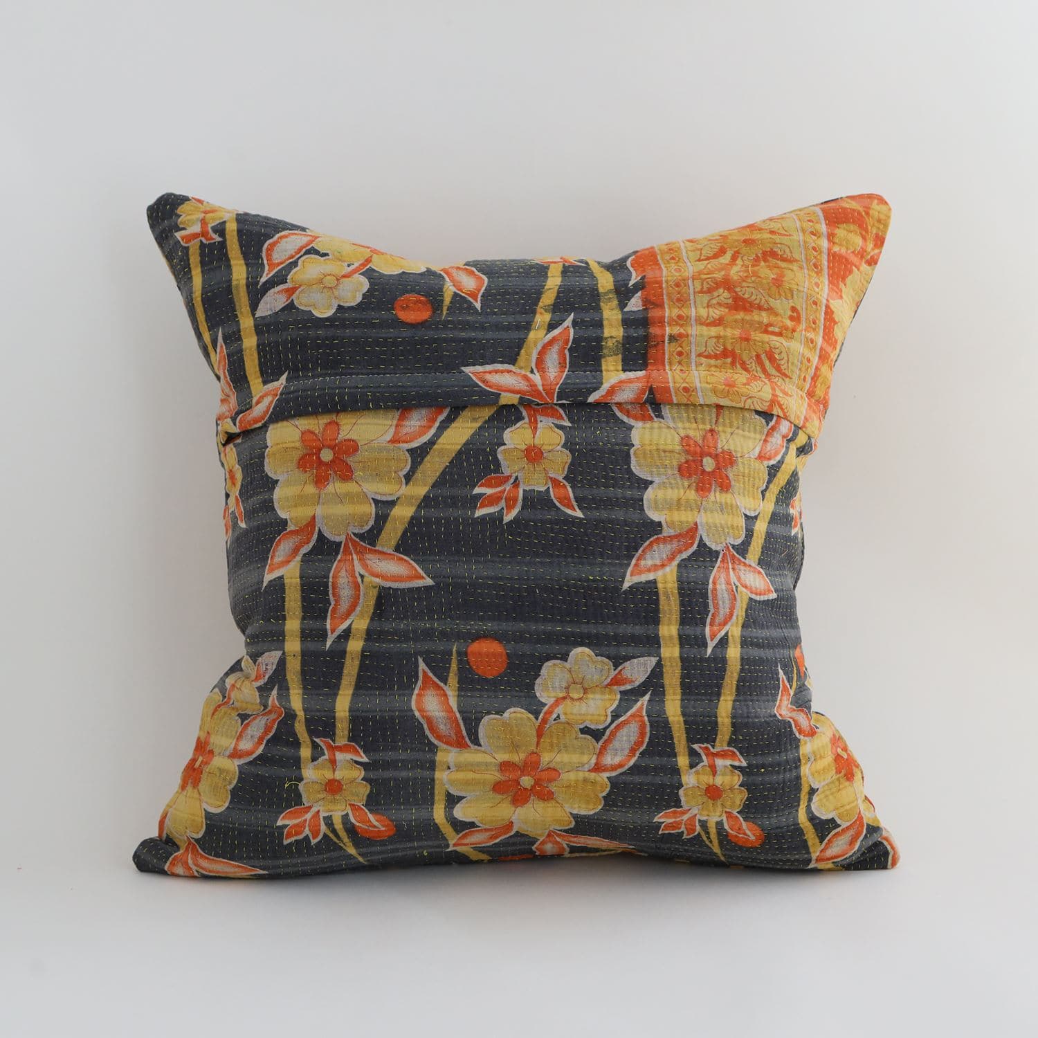 ラリーキルトを使ったクッションカバーです。ラリーキルトは、インド・パキスタンなどの中東アジアで、永い間受け継がれてきた伝統的な布です。古くなったサリーやデュパタ、腰布・古いハギレ等を貼り合わせてパッチワークし、丁寧に刺し子で合わせたもの。インダス河流域の遊牧民の家々では、嫁入り道具として母親から娘へ受け継がれています。気の遠くなるような作業を経て、わが子へ想いをこめて手渡します。一枚一枚に物語があって、何千年にも渡り母から娘へと伝えられる品。布の貼り合わせ方、刺し子の細やかさ、生地の厚みや柄など1つとして同じものはありません。丁寧にハンドメイドで作られているからこその味わいと魅力があります。